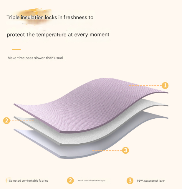 • Triple-Layer Insulation: Features a premium three-layer insulation system: a durable outer Oxford fabric, a thick pearl cotton insulation middle layer, and a food-grade PEVA waterproof inner lining. This construction effectively keeps food hot, cold, and fresh for hours.