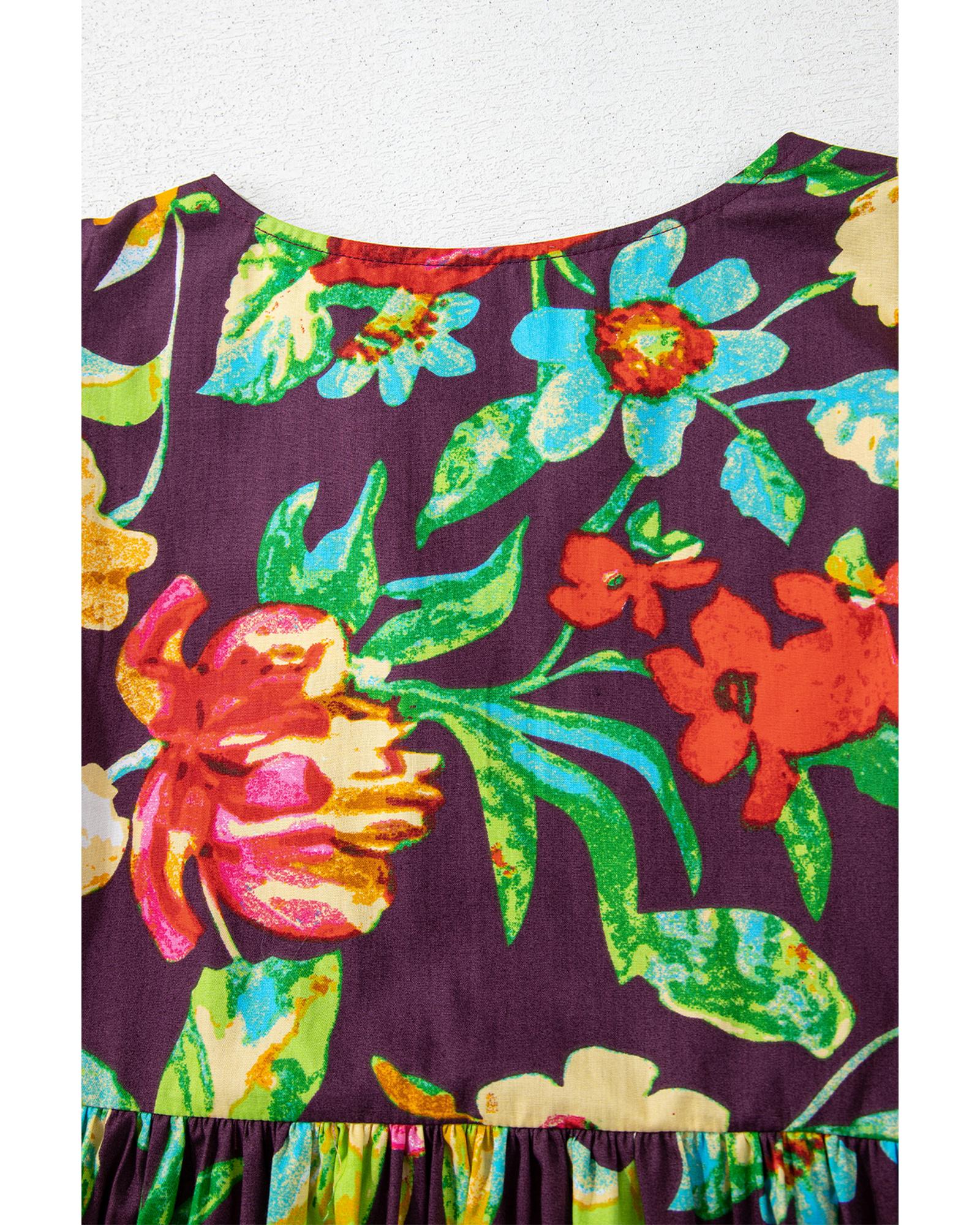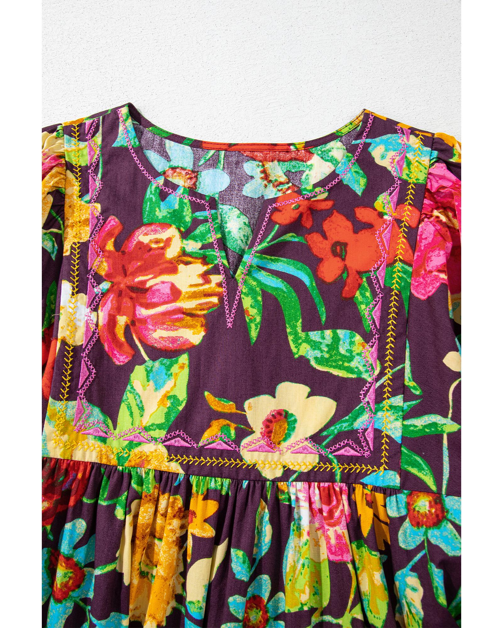Greyish Purple Rose Flower Embroidered Trim Half Sleeve Blouse – S