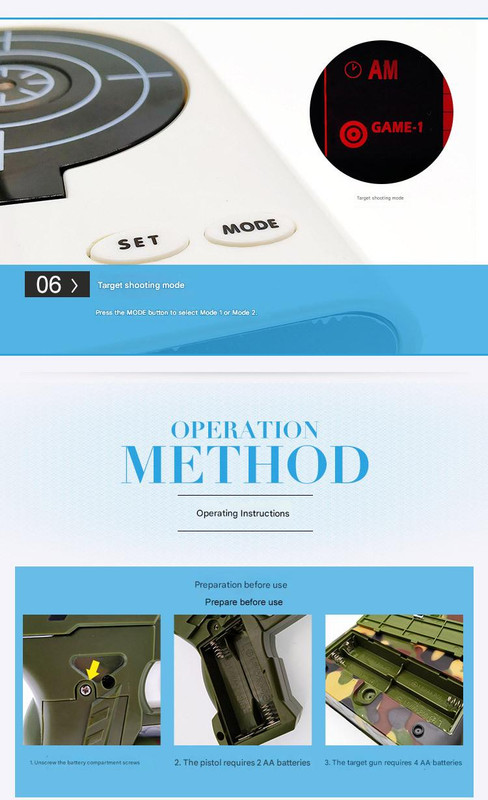 Batteries are NOT included unless specified. Some models may feature USB charging for the base unit (USB cable might be included in such cases), while the gun remains battery-operated. This product contains an infrared emitter in the gun; do not aim directly at eyes or face. This is a toy alarm clock and the “gun” is a toy infrared emitter, not a real firearm. Adult supervision may be appropriate for younger users. Ensure correct battery polarity when inserting batteries. The infrared gun requires a line of sight to the target for accurate deactivation. This toy product is designed for amusement; its effectiveness as an alarm depends on user interaction.