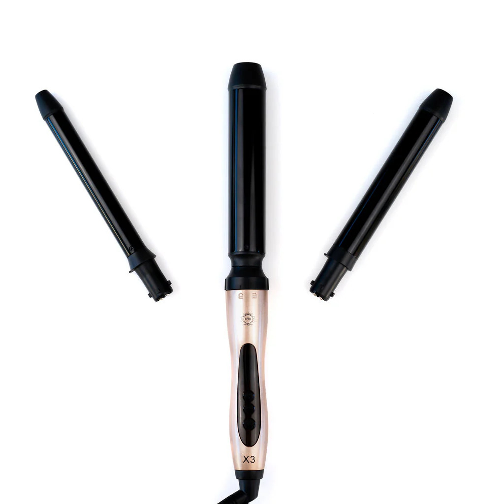 H2D Black X3 Curling Wand. An innovative, effective curling wand that features high power, 3 interchangeable heads to create the perfect curls, soft waves and incredible texture with fast variable heat for consistent, dependable, results on any type of hair. Shiny, Healthy, Long Lasting Curls WavesWide