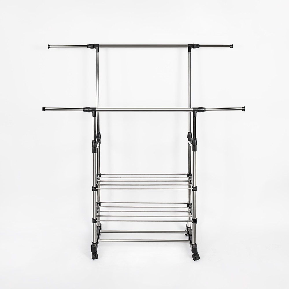 Designed for various settings, it is ideal for laundry rooms, bedrooms, and even as a display in stores or markets. The double bar feature allows you to accommodate a larger amount of clothing, while the two-layer rack provides space for shoes and shoe boxes.
