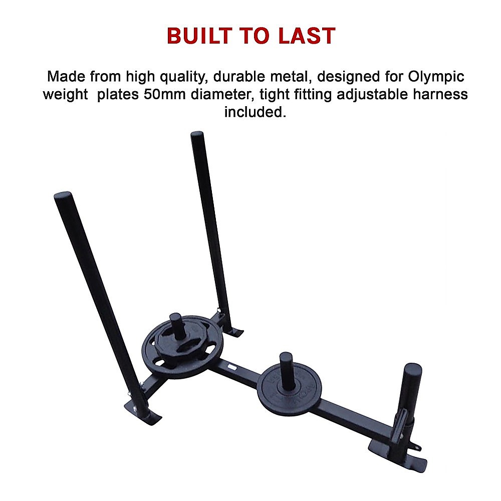 The Heavy Duty Sled is portable and easily transportable and can be taken anywhere enabling you to work out where and when you want. Its full metal construction provides the strength you need. A tight-fitting adjustable harness is included for your safety. The sled is specifically designed for Olympic weight plates of 50mm in diameter.
