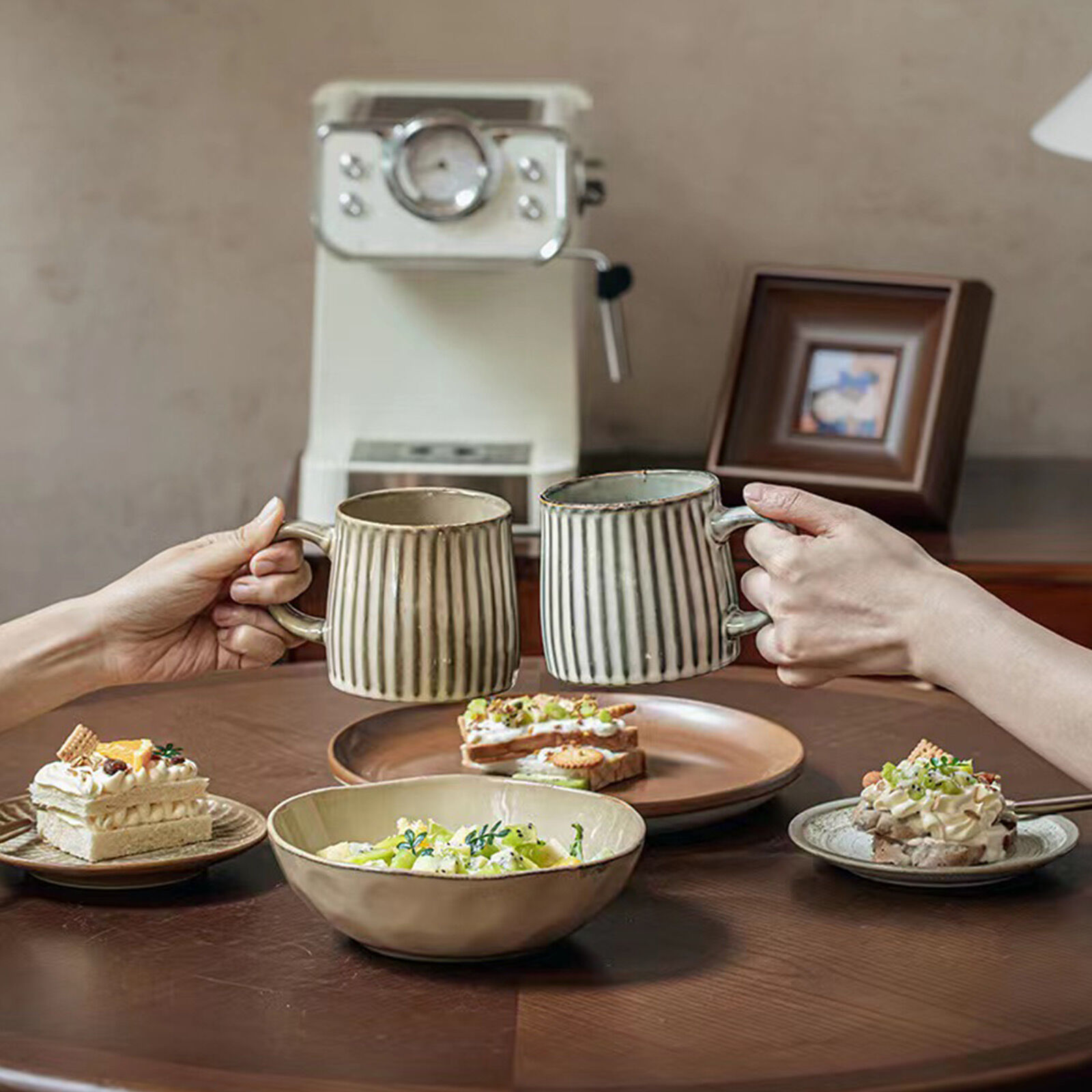 This stylish mug features earthy tones with a matte, speckled finish that evokes a natural, calming aesthetic. The ribbed striped pattern and soft tones create a minimalist yet refined design, making it a versatile addition to your drinkware collection.
