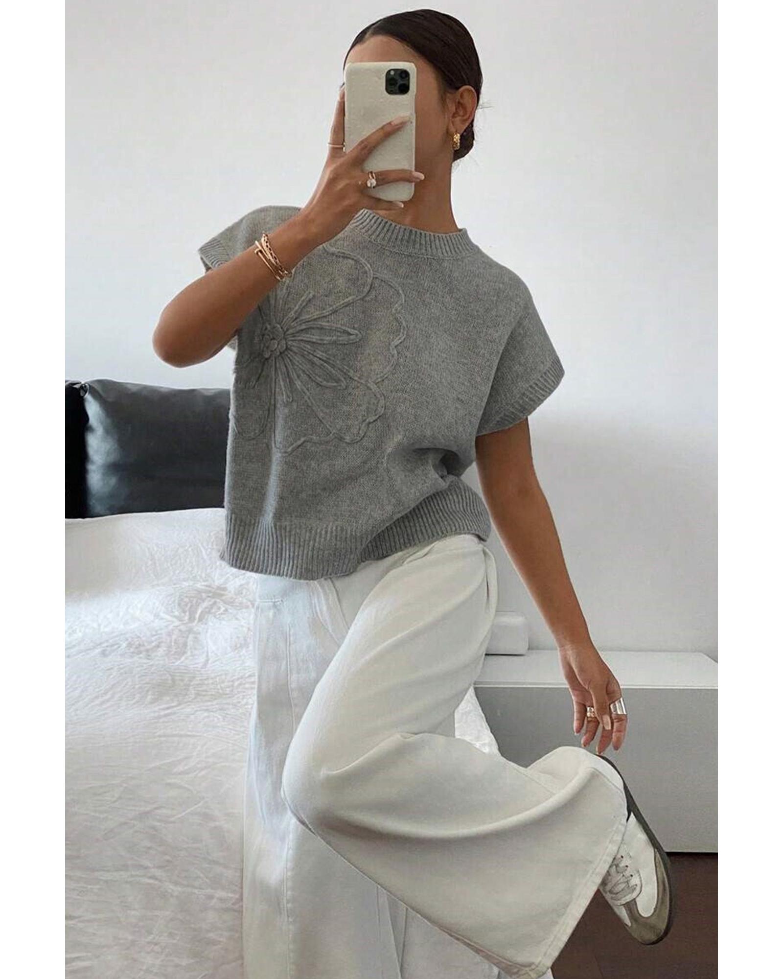 High Flower Pattern Ribbed Trim Short Sleeve Boxy Sweater – XL
