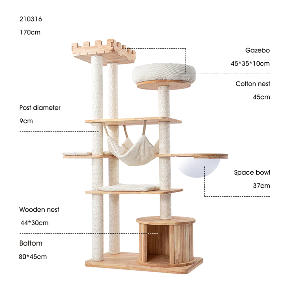 HONEYPOTCAT MZ Grand Elegance Cat Catsle With Space Capsule combines durable scratch-resistant wood with a built-in hammock cat bed, offering both functionality and versatility. The dual-purpose space bowl holder can be replaced with a soft fabric pad, catering to different seasonal needs. In colder weather, the hammock can be swapped out for a plush fabric version, providing your cat with a warm and cozy resting spot. The hammock is securely fastened with Velcro, making it easy to detach and clean, ensuring a hygienic and comfortable environment for your pet.