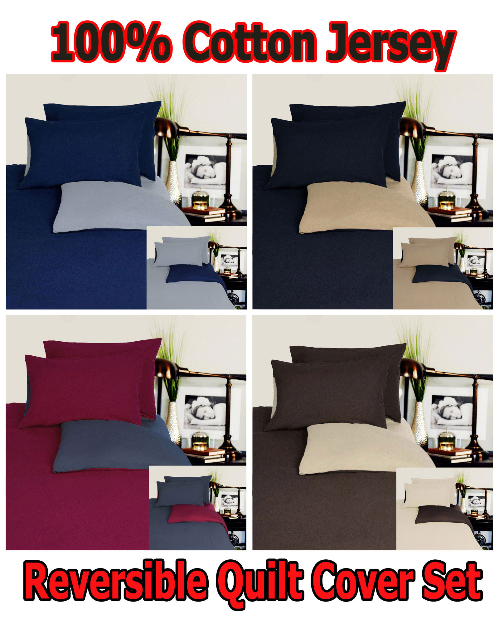 Flip the quilt cover over to change your color scheme instantly and easily with this two tone fully reversible set made from soft combed cotton jersey knit, is comfortable and cool in summer and warm in winter.