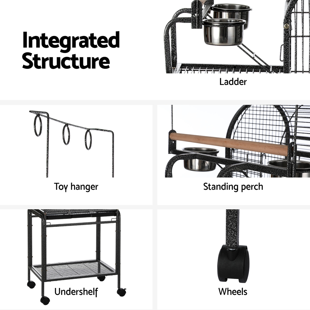 Explore the ultimate habitat for your feathered friends with this dynamic i.Pet bird cage. It seamlessly integrates playful elements like a climbing ladder and a toy hanger with practical features such as wooden perches and feeders. An undershelf provides additional storage space. The design emphasises ease of use, with a slide-out cleaning tray and a removable base for simple maintenance. Multiple doors offer effortless access to the cage, and the inclusion of smooth-rolling castor wheels ensures convenient mobility. Crafted with attention to detail, this cage is a haven of comfort and fun for your birds.