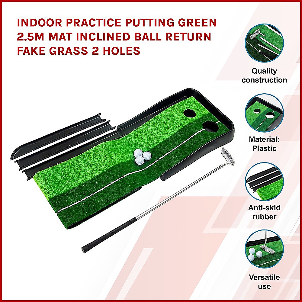 Indoor Practice Putting Green 2.5m Mat Inclined Ball Return Fake Grass 2 Holes