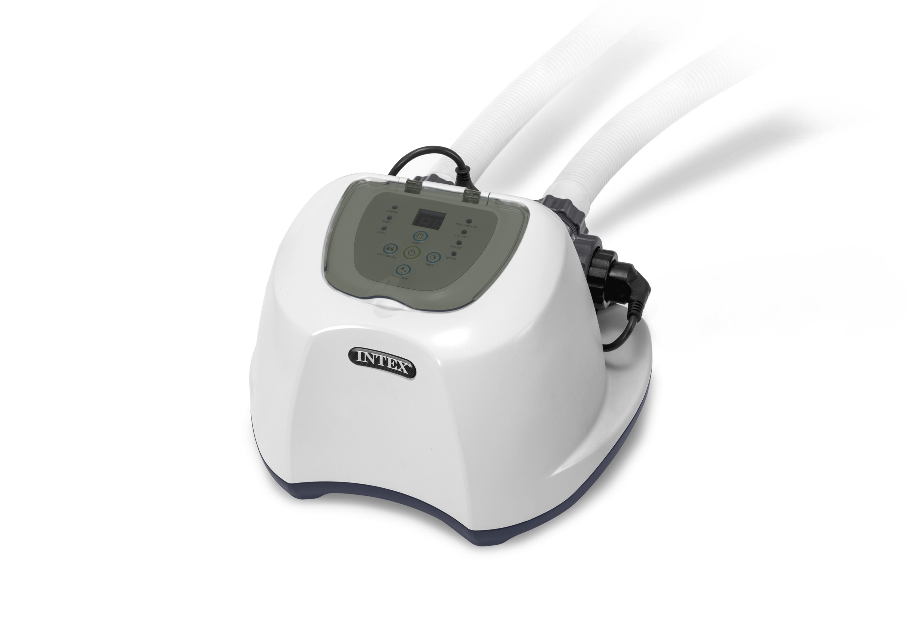 Intex Salt Chlorinator Krystal Clear Above Ground Pool 5g/hour 26668SAY GOODBYE TO CHLORINE!Eliminates bacteria and algae from pool water using virtually undetectable amounts of economical, eco-friendly salt. This system produces low levels of natural chlorine that swimmers neither feel nor smell. The result is soft, fresh, clean water without the potential harsh side effects of packaged pool chemicals!Chlorine generator Intex 26668 is designed for water purification in frame and inflatable pools.Fights the formation of mucus, moss on the walls and bottom of the pool, and also helps to keep the water from the multiplication of microbes and green ooze.The Krystal Clear Seawater System combines a unique two-step pool sanitisation technology. By using common pool salt, the Krystal Clear Chlorinator simplifies pool maintenance and eliminates the need for pool chemicals, and provides clean, clear water that is non-irritating to skin and eyes.Has a touch control panel with the ability to lock, allows you to set the operating modes:- timer for automatic operation,- pressure and water flow sensor,- self-diagnostics and auto-shutdown system.Designed for use with a filter pump with a capacity from 2650 to 11,355/ h (purchased separately).Suitable for pools up to 26,500 litresRequired pump capacity: between 3,407 l and 11,355l/hourMaximum chlorine production: 5g/hourDetails: