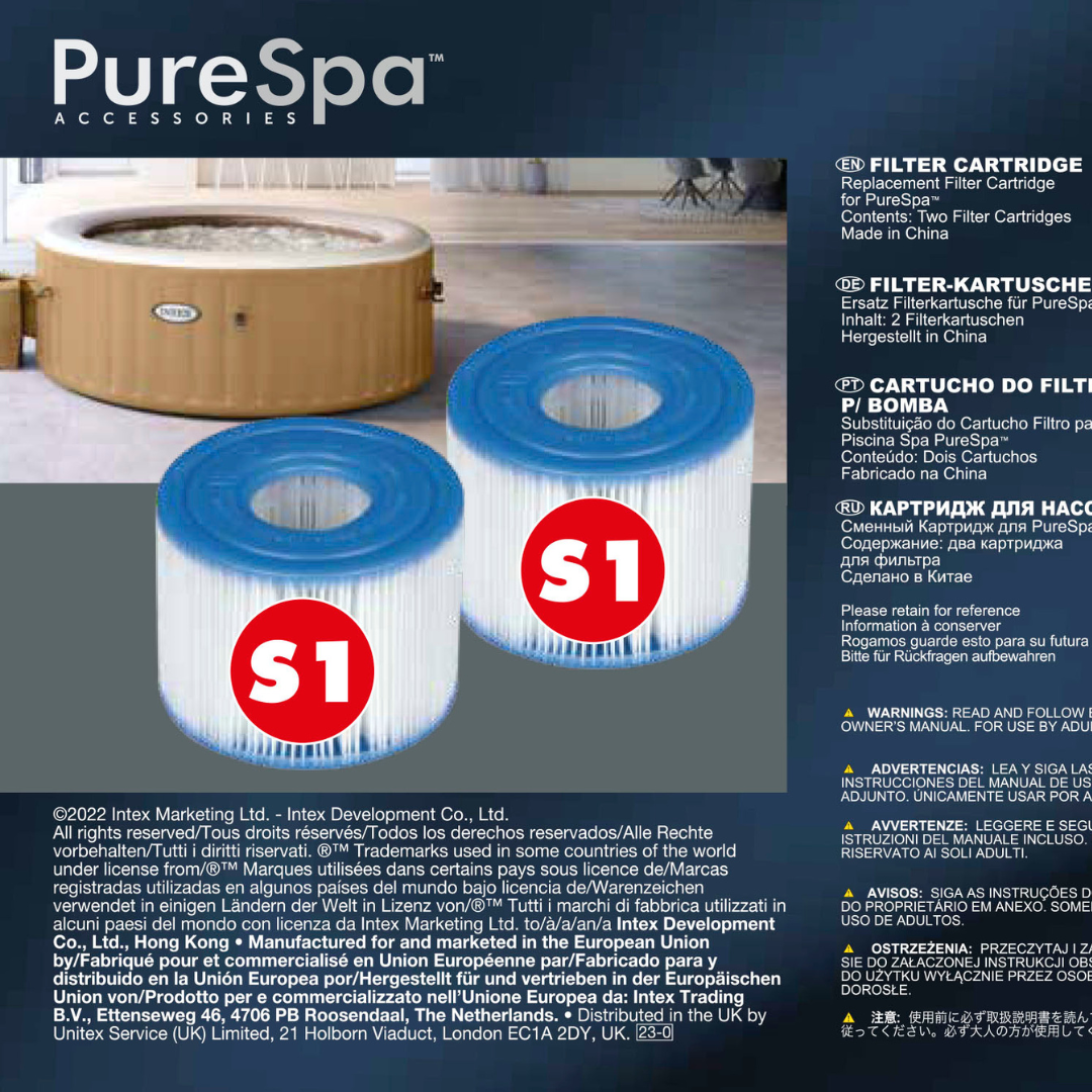 Keep your spa water clean and Intex PureSpa performing at its best by using genuine Intex PureSpa Type S1 Pool Filter Cartridges. This is the authentic replacement cartridge for your Intex PureSpa. It works with all Intex PureSpa models. Replace your filter cartridges regularly for the best results. It is recommended that you replace cartridges every 2 weeks to maximize your spa’s performance. Pack of 2 genuine Intex Type S1 filter cartridgesThe S1 Cartridge Filter is sure to keep your PureSpa Jet Massage water clean and freshMade with easy-to-clean, heavy-duty Dacron paper for the ultimate filtrationFor maximum efficiency, clean cartridges each week and replace once a month or soonerWorks with all Intex PureSpa models