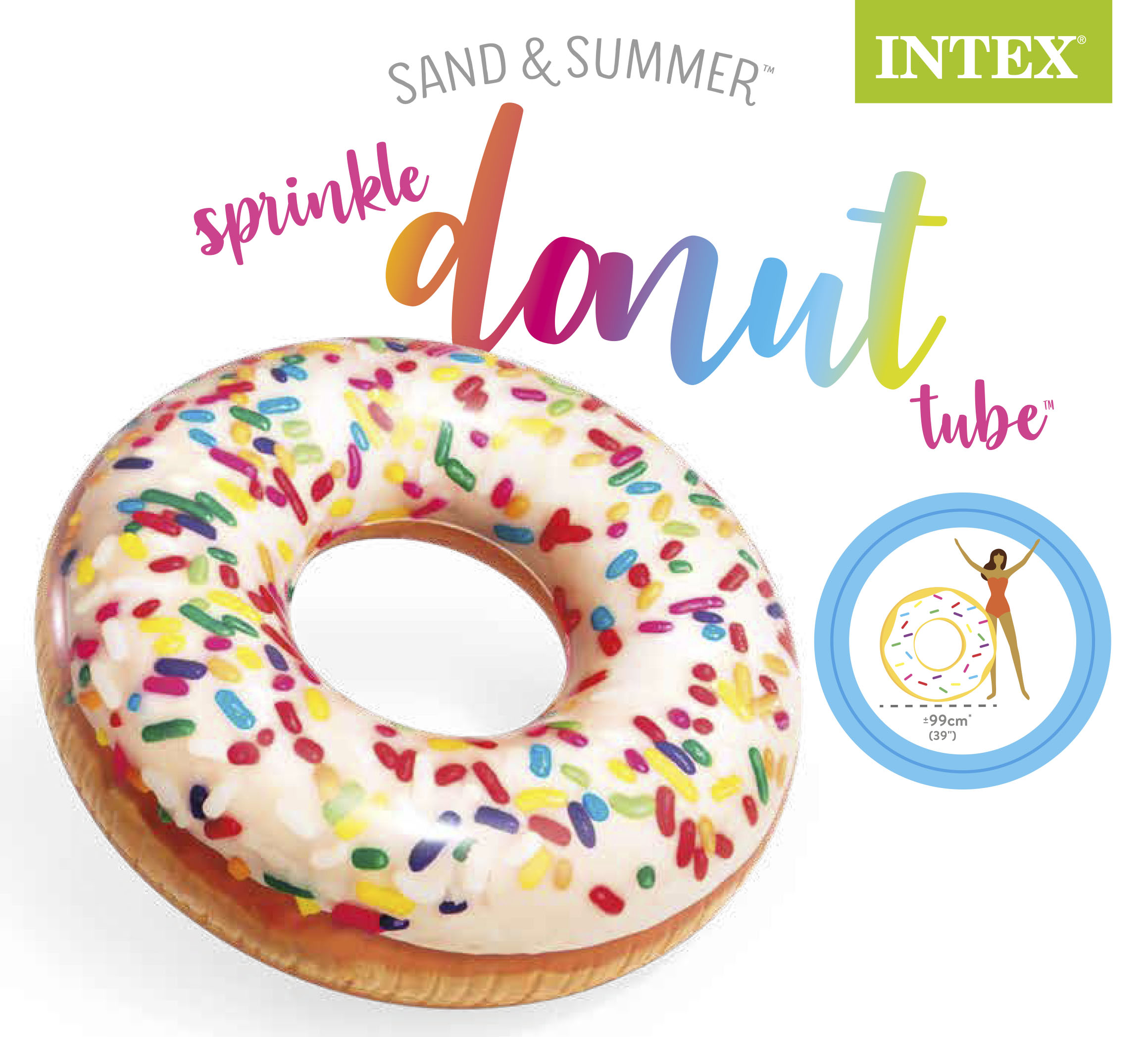The Intex Sprinkle Donut Tube looks almost real you could take a bite out of it! Designed with realistic printing for added fun. Deflated 45″ (1.14m) Inflated 39″ x 10″ (99cm x 25cm) 10ga (0.25mm) vinyl Fun donut design Repair patch Shelf box 220 lb (100 kg) max weight limit Age Grading 9+