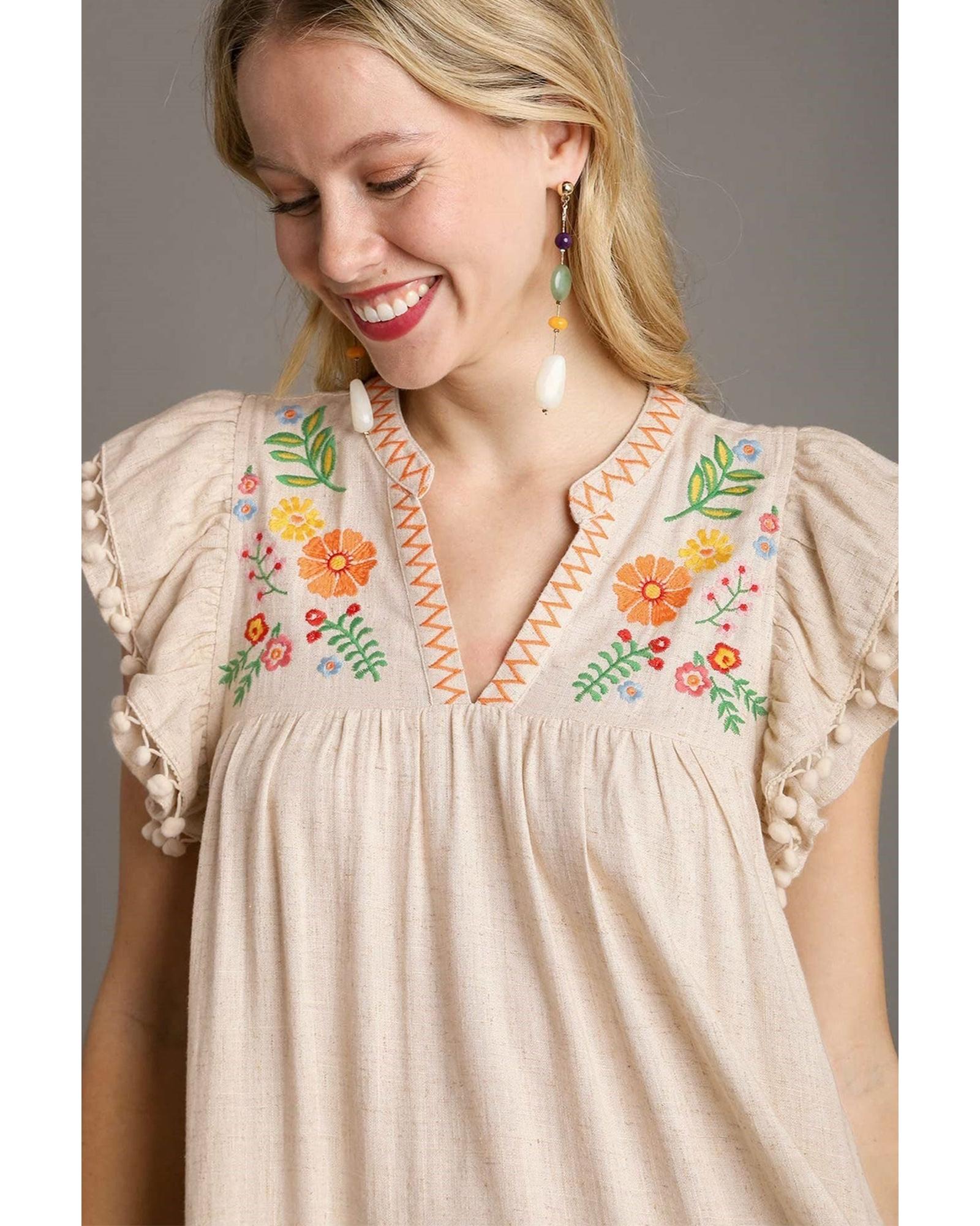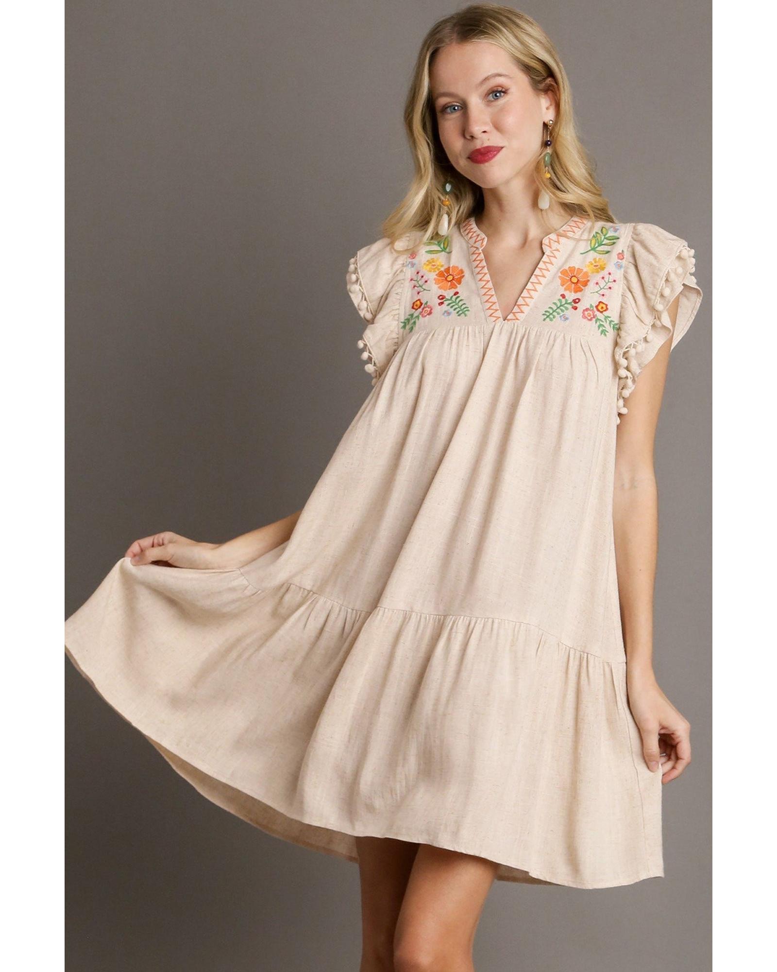 Jet Stream Linen Embroidery Split Neck Pom Pom Ruffle Sleeves Flowy Short Dress – L