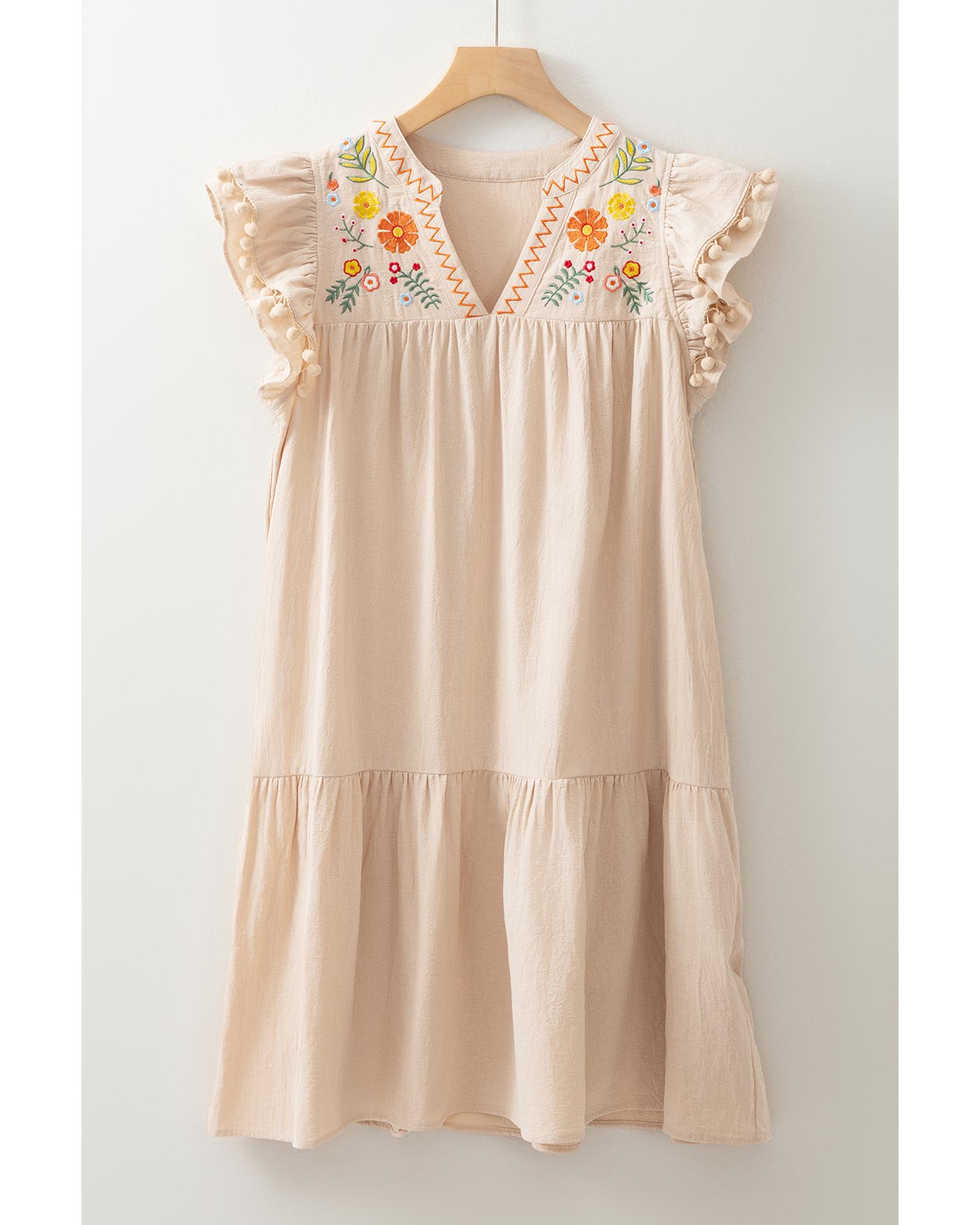 Jet Stream Linen Embroidery Split Neck Pom Pom Ruffle Sleeves Flowy Short Dress – S