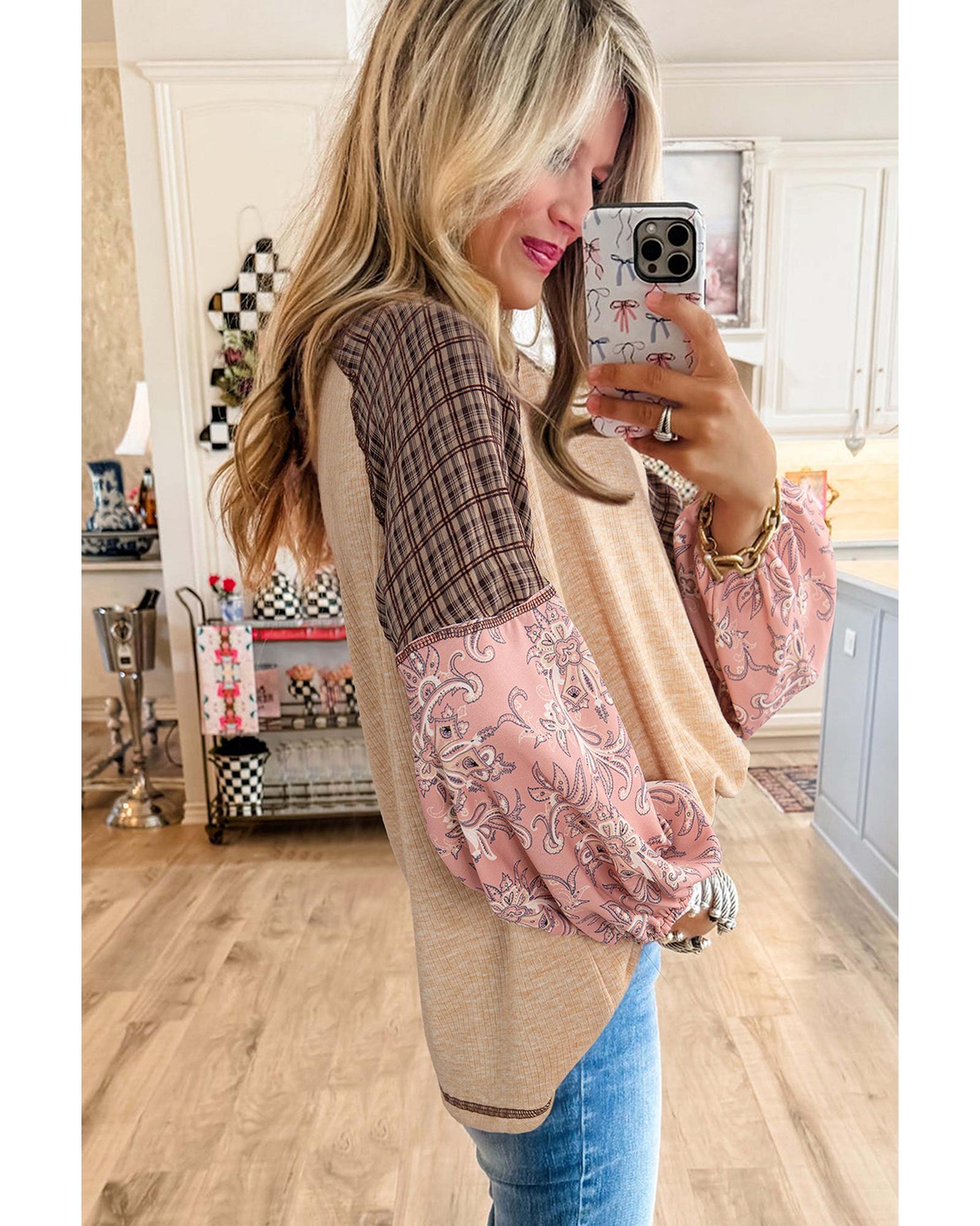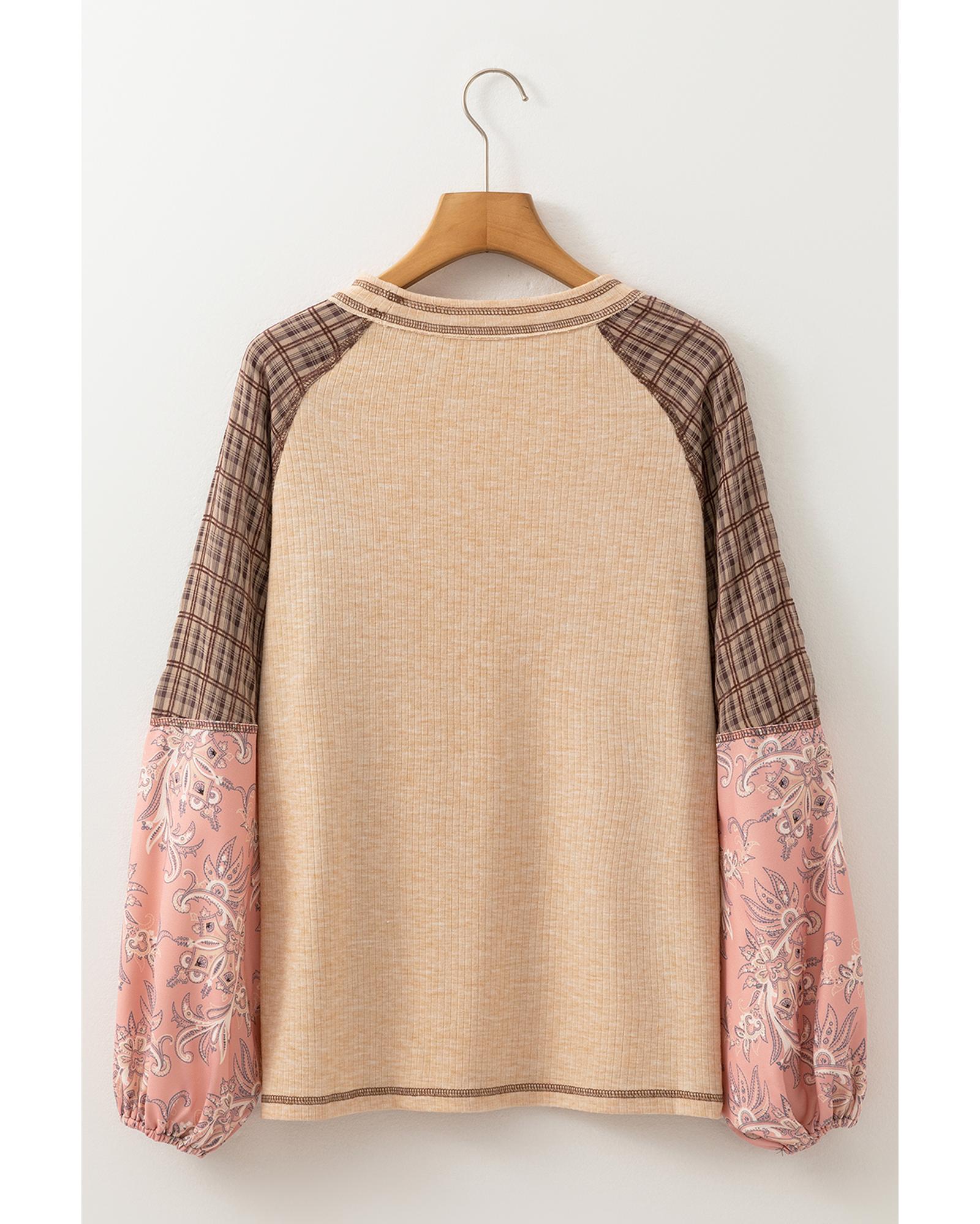 Jet Stream Mixed Print Raglan Sleeve Ribbed Knit Patchwork Blouse – L