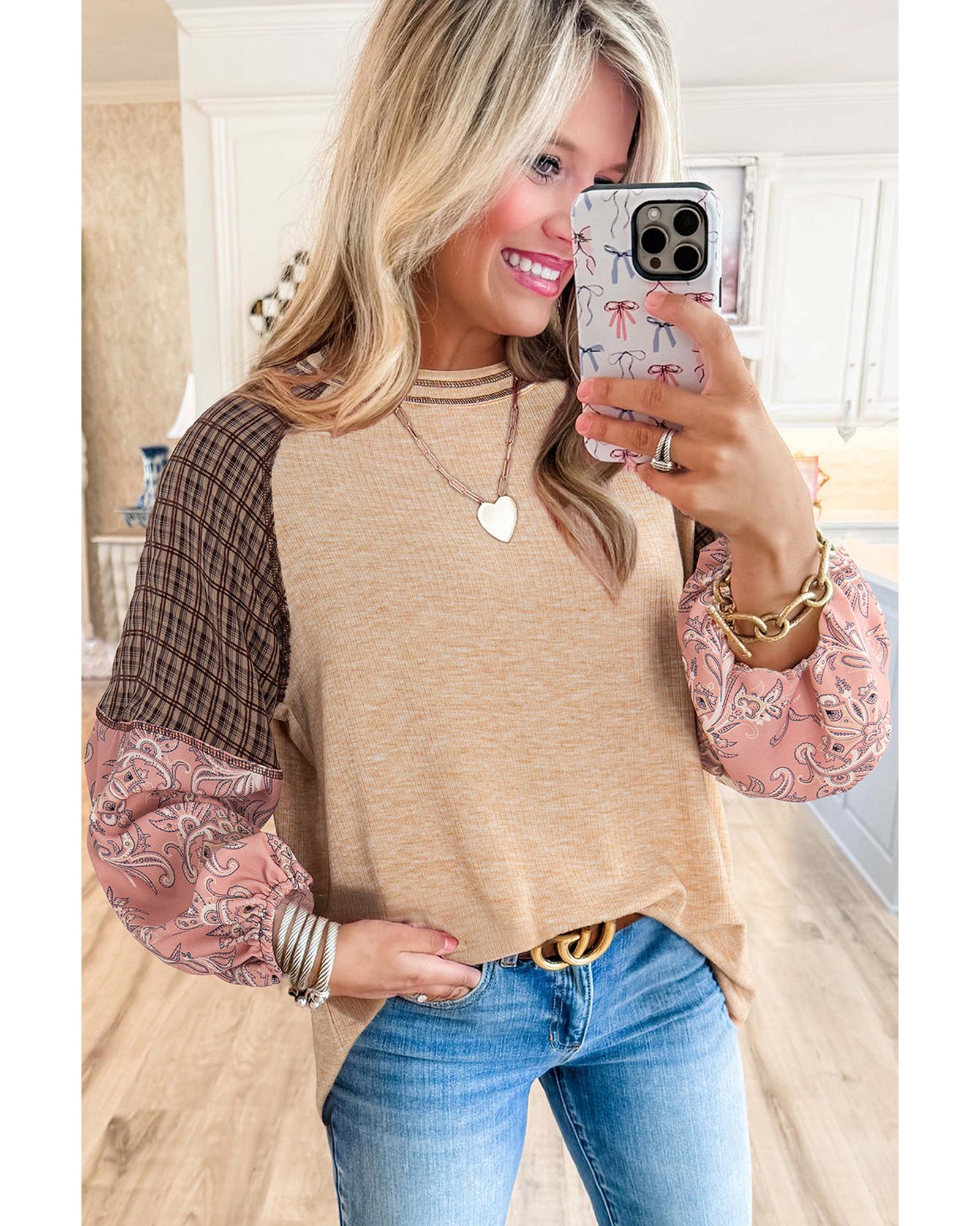 Coffee Ruffled Floral Sleeve Patchwork Waffle Knit O Neck Blouse - L
