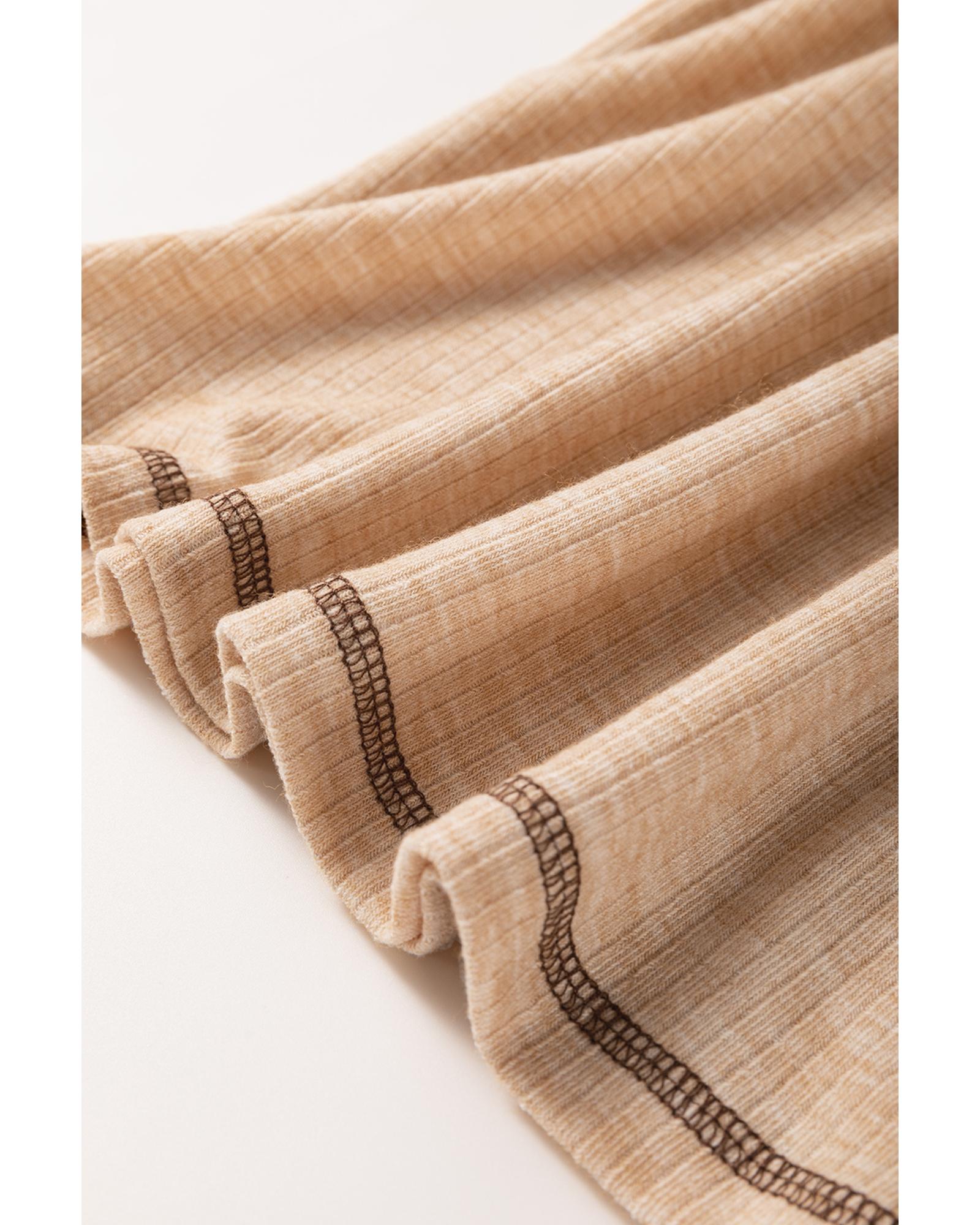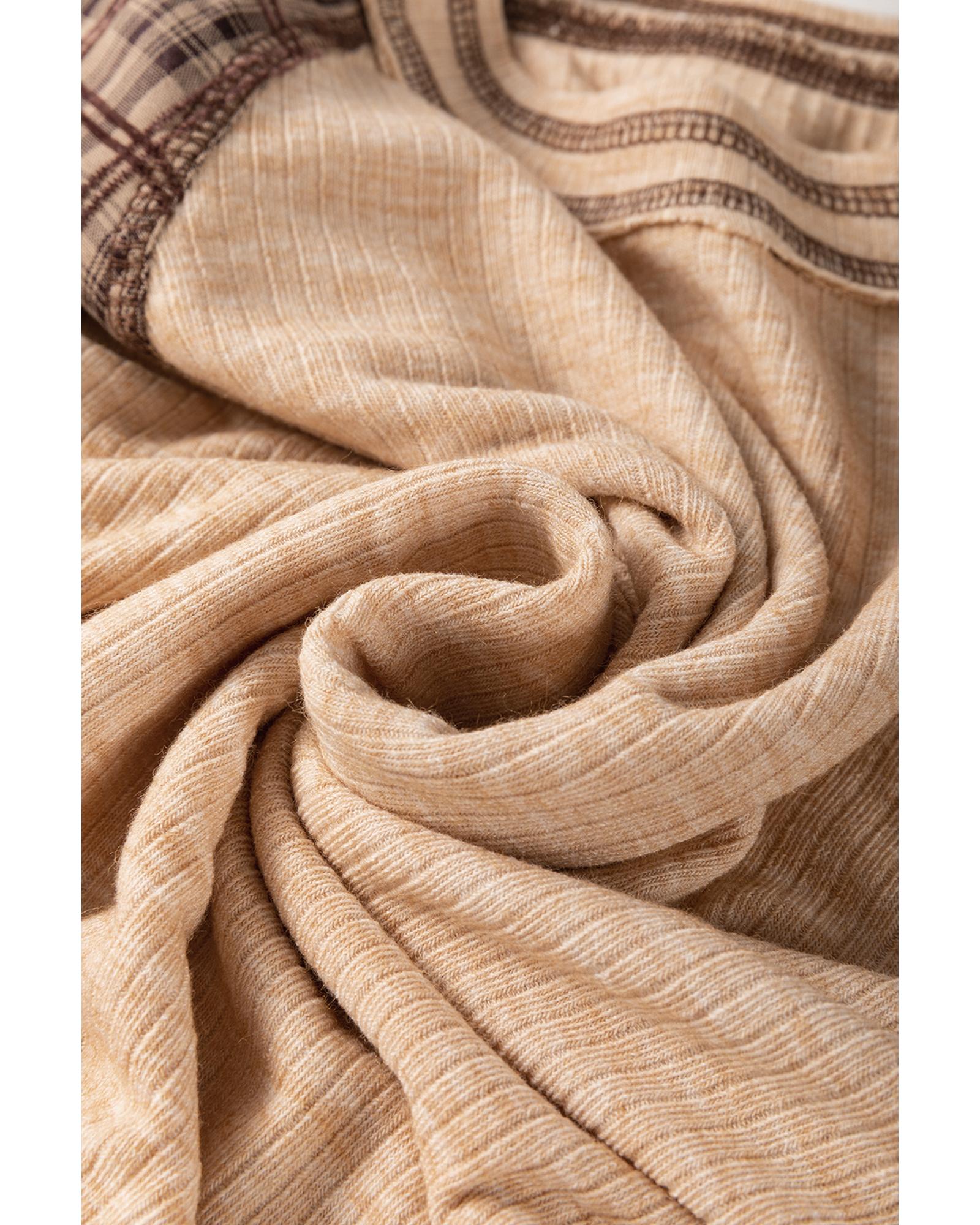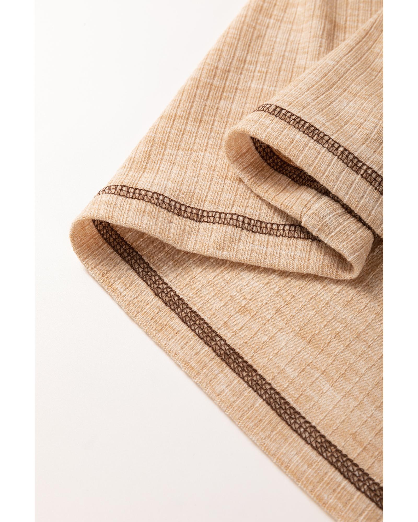 Coffee Ruffled Floral Sleeve Patchwork Waffle Knit O Neck Blouse - S Original price was: $55.99.Current price is: $29.99.