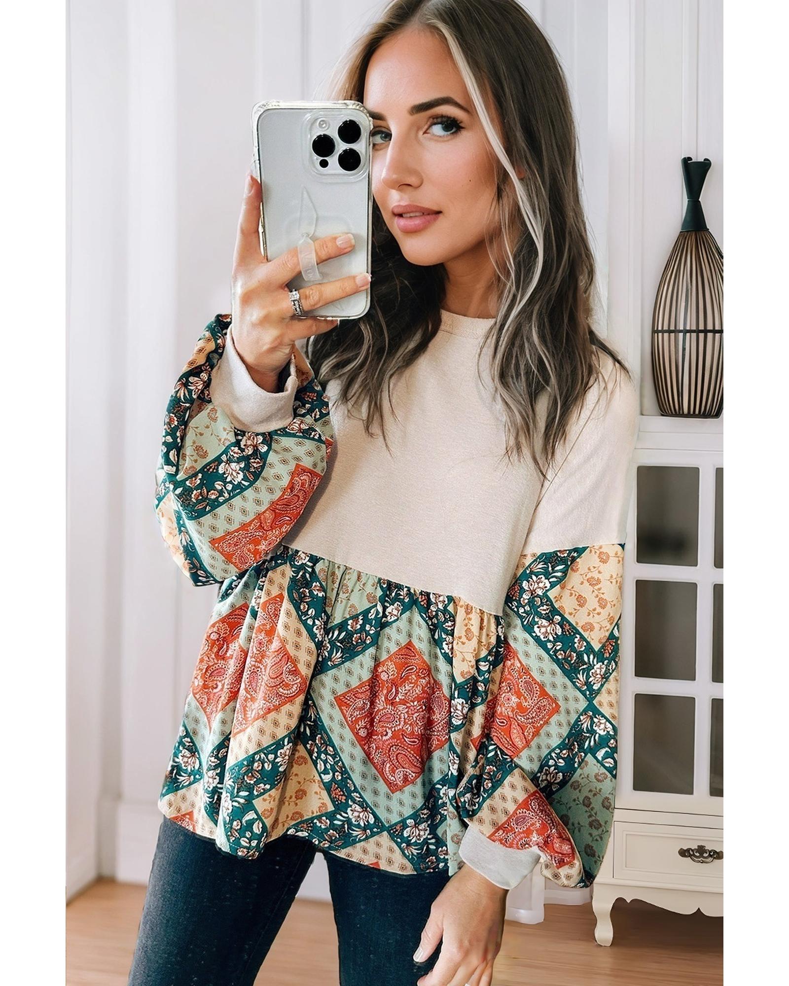 Jet Stream Paisley Geometric Patchwork Crew Neck Loose Fit Top – M