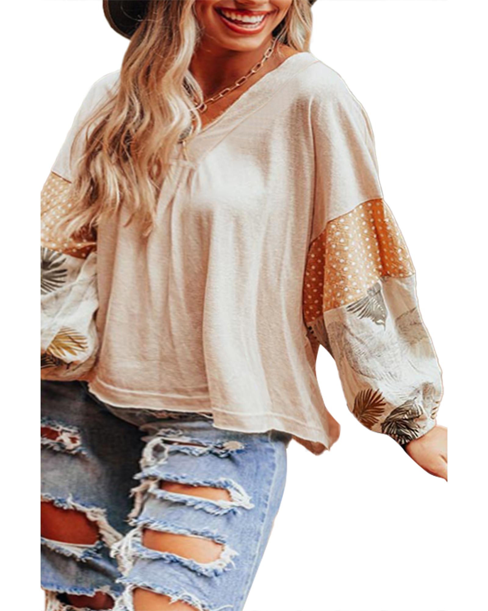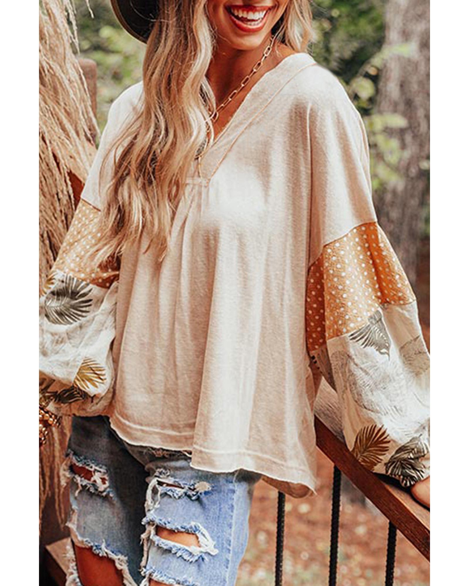 Jet Stream Palm Leaves Polka Dot Puff Sleeve Patchwork V Neck Loose Blouse – L
