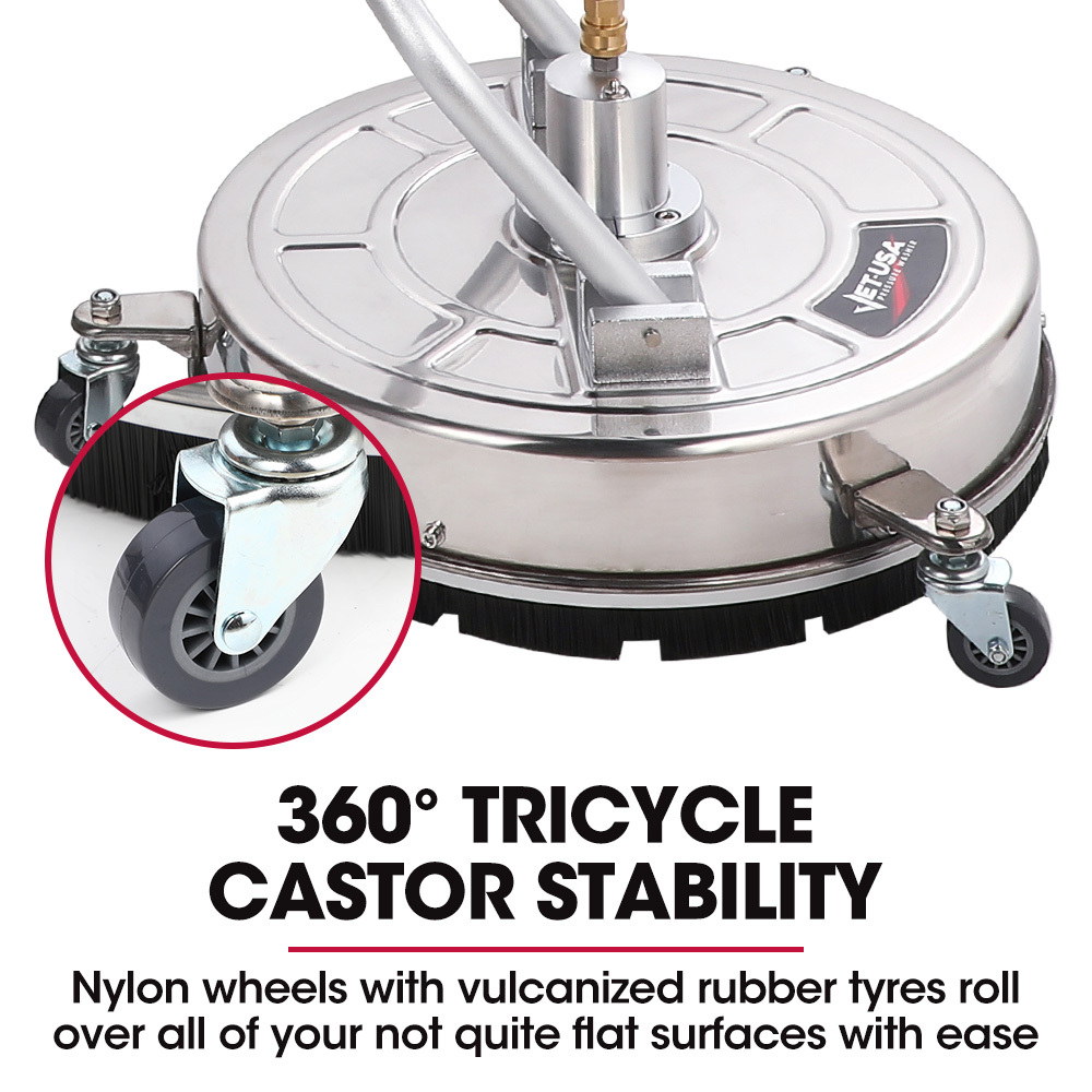 It’s constructed from 304 Stainless steel for corrosion resistance and durability. With smooth rolling nylon castors it is the ideal tool for any of your flat surfaces, wooden decks, concrete drives and paths, brick and tiled patios, pool decks, and any other flat durable surface that requires cleaning.