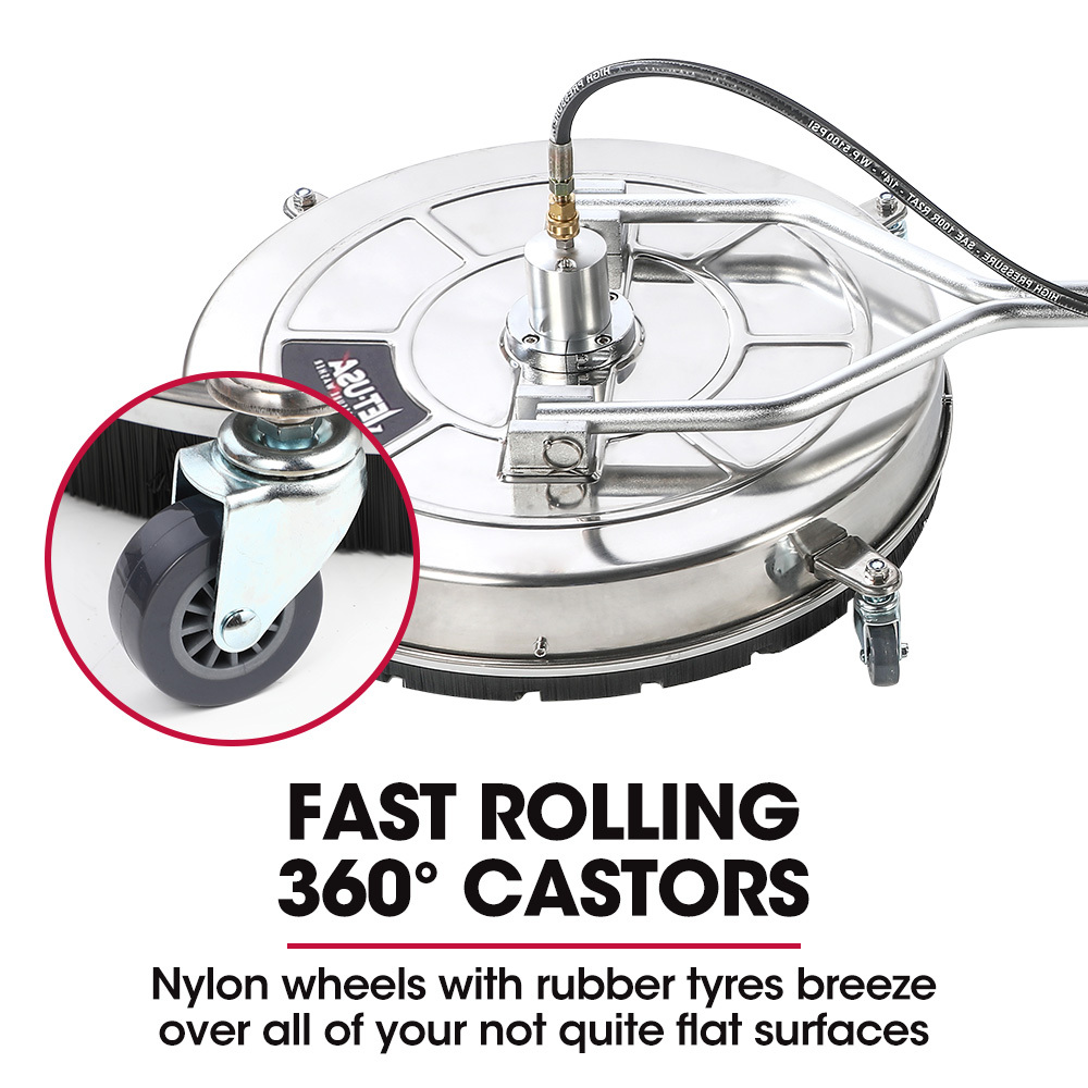 It’s constructed from 304 Stainless steel for corrosion resistance and durability. With smooth rolling nylon castors it is the ideal tool for any of your flat surfaces, wooden decks, concrete drives and paths, brick and tiled patios, pool decks, and any other flat durable surface that requires cleaning.