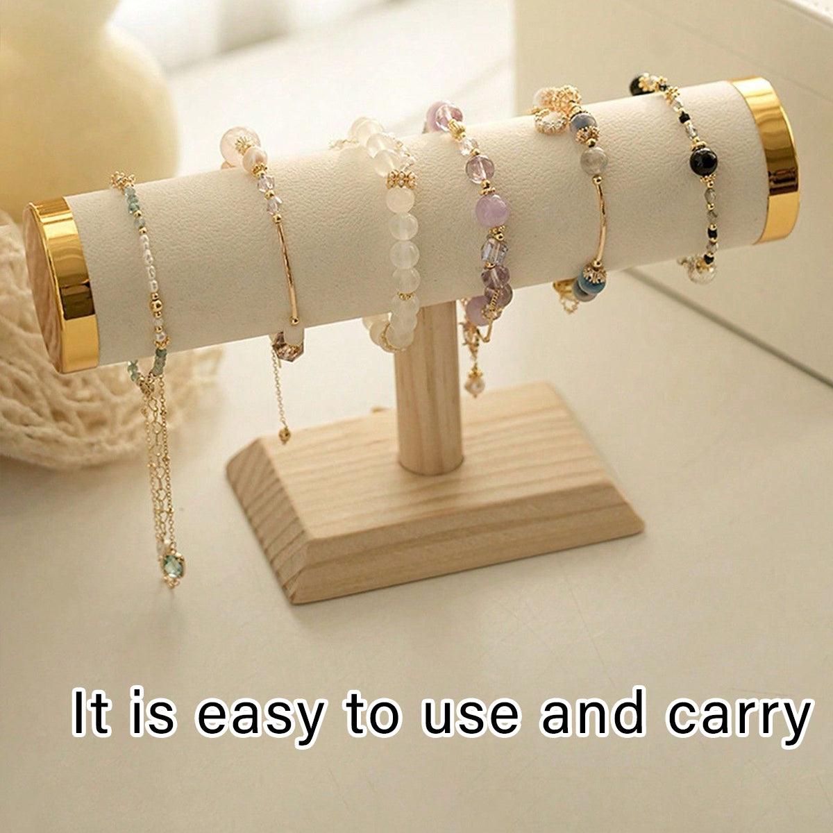 Display and organise your jewellery with this elegant and practical jewellery display stand. Perfect for showcasing bracelets, bangles, necklaces, and watches, this stand is crafted with a soft fabric surface to protect your accessories from scratches and a sturdy wooden base for stability. Compact and lightweight, it fits perfectly on countertops and is ideal for home use, retail displays, or craft fairs. The natural wood and beige design add a sophisticated touch to any setting while keeping your jewellery beautifully arranged and accessible.