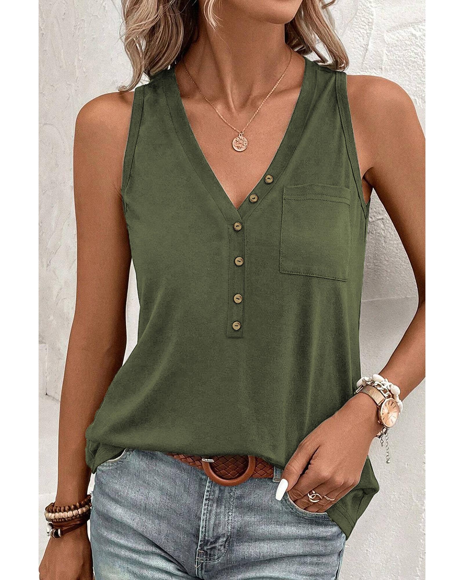 Jungle Green Half Button V Neck Patched Pocket Tank Top – XL
