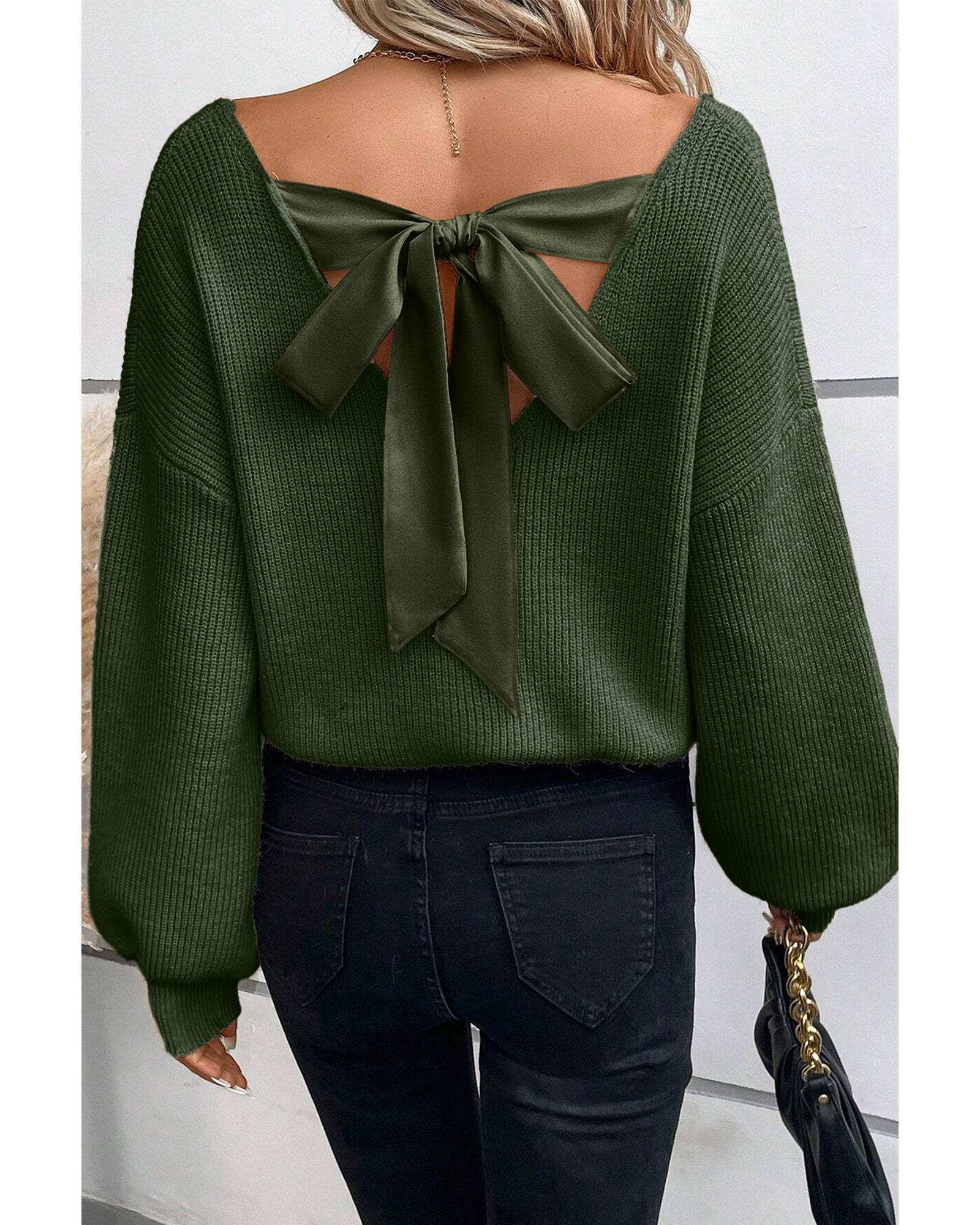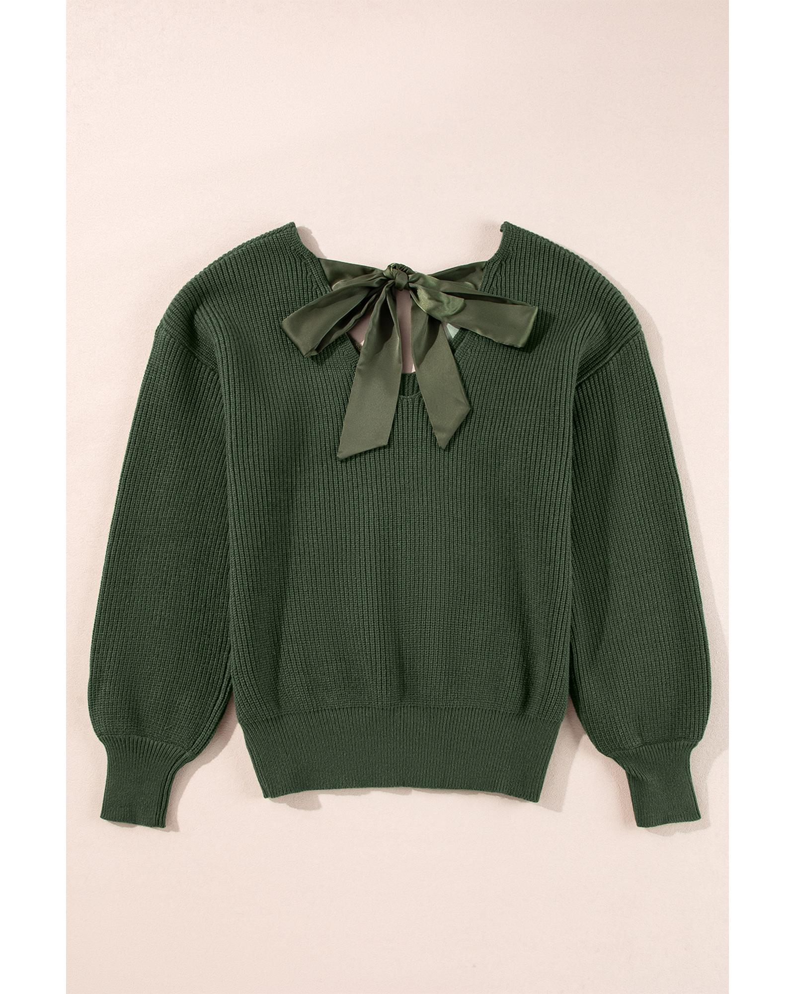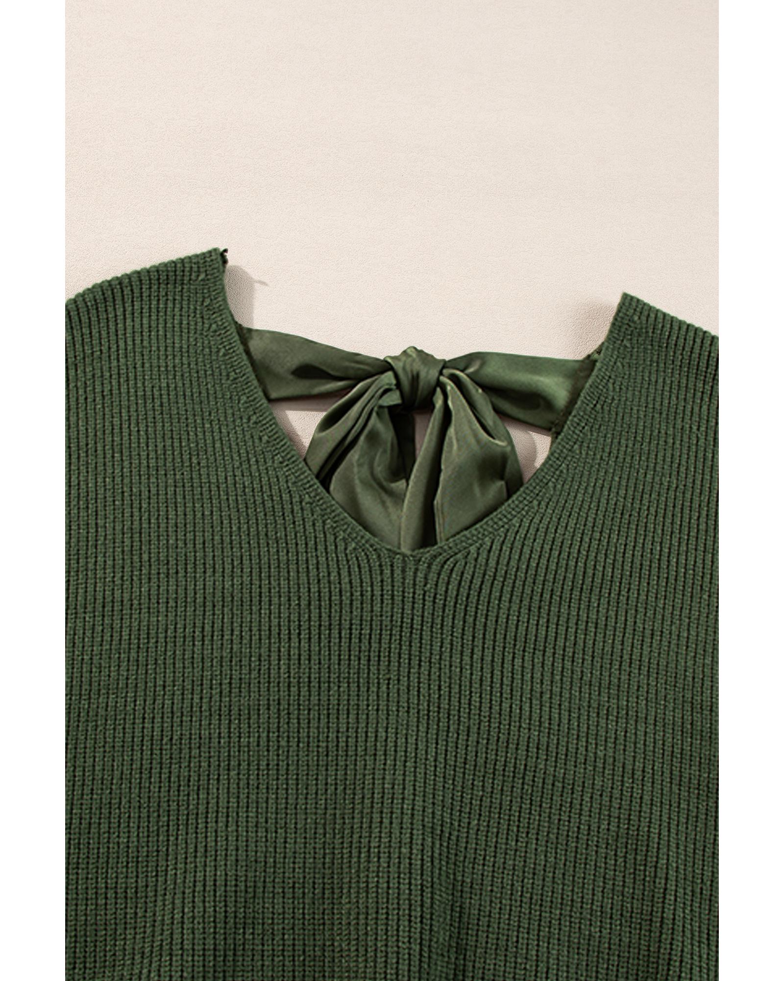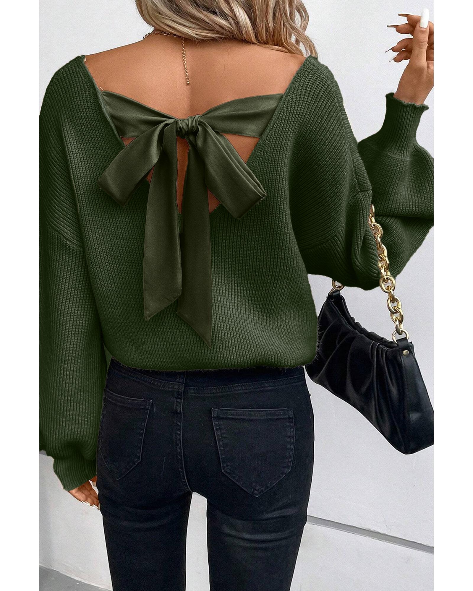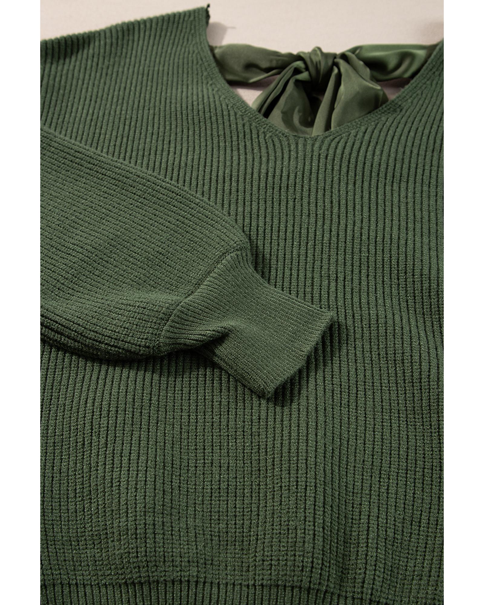 Jungle Green Lantern Sleeve V Neck Knot Back Sweater – XL