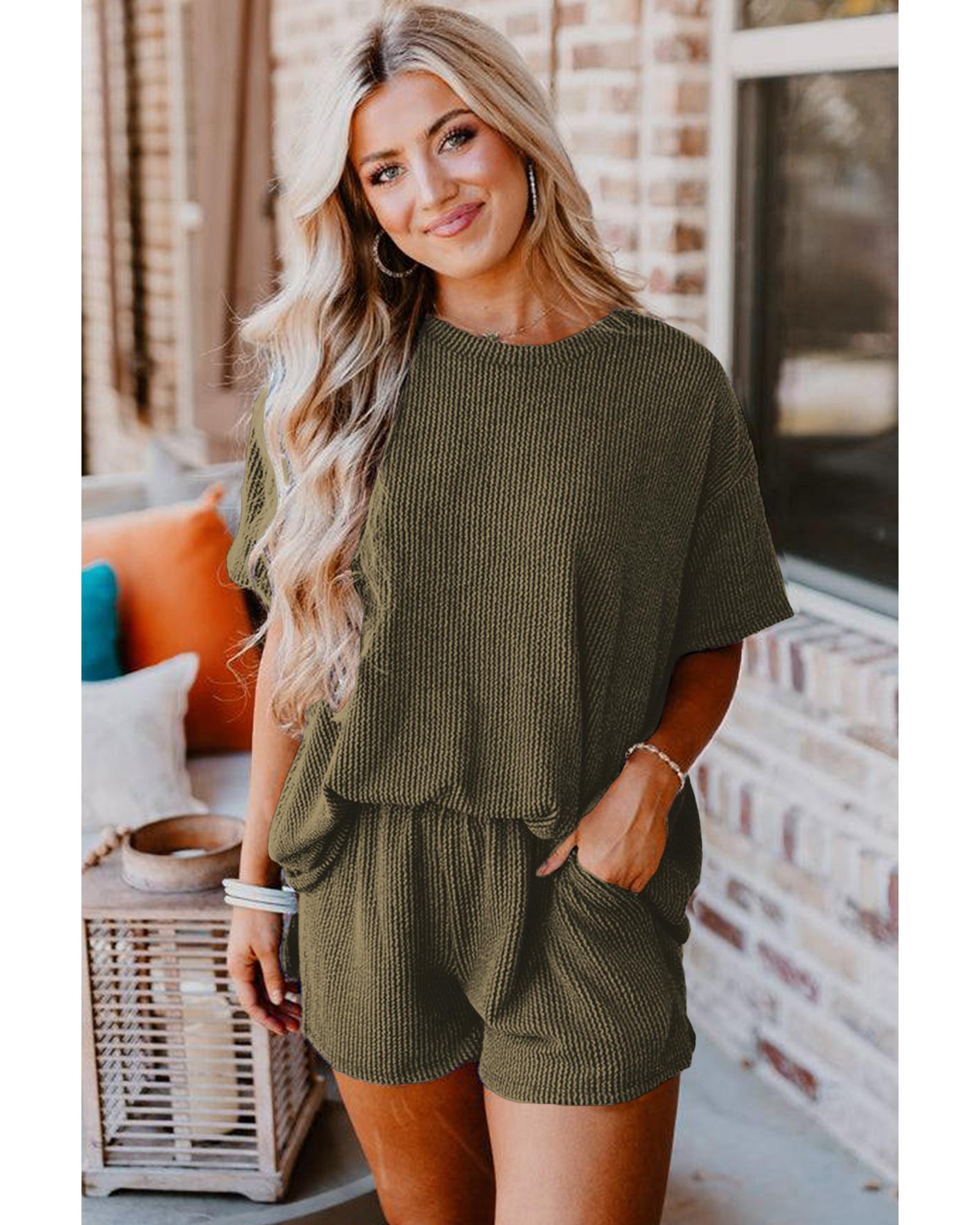 Jungle Green Ribbed Textured Knit Loose Fit Tee and Shorts Set - M