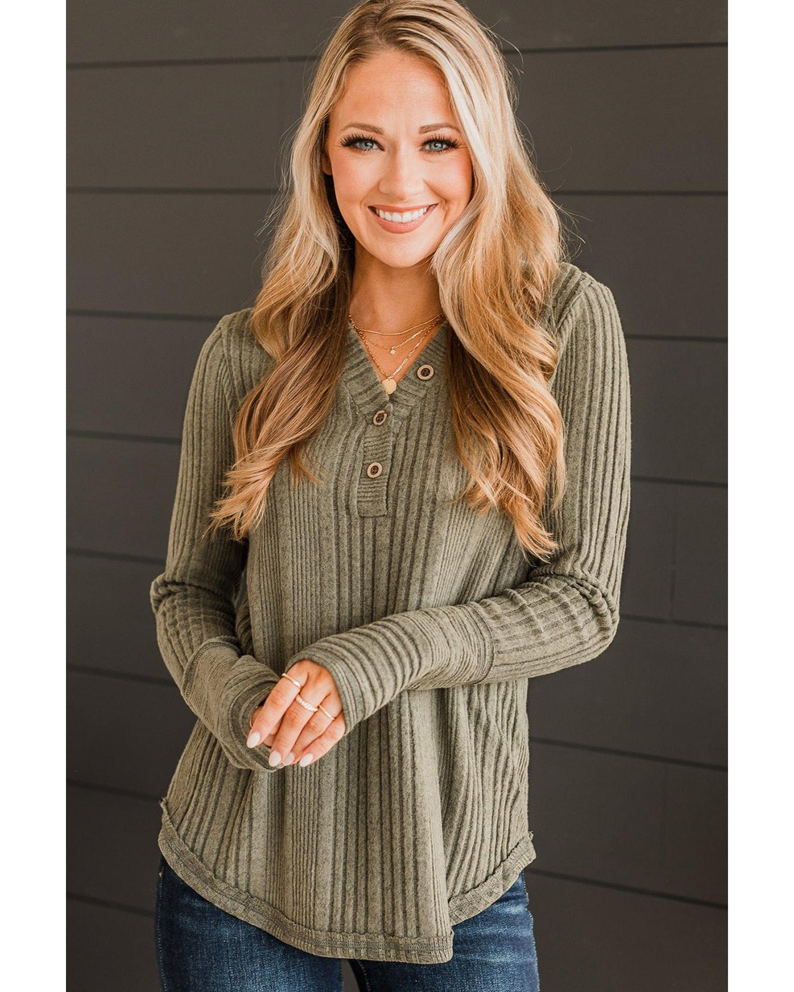 Jungle Green V Neck Buttoned Ribbed Knit Top – L