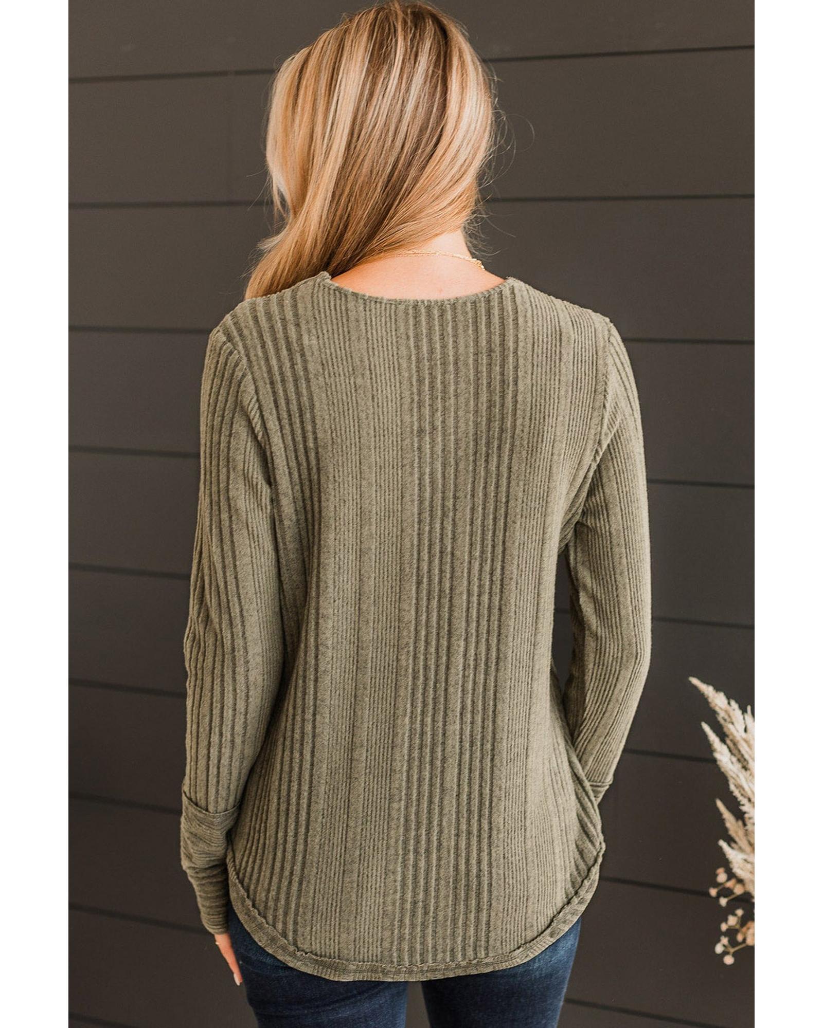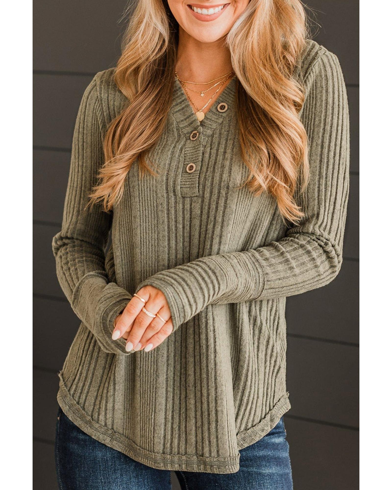 Jungle Green V Neck Buttoned Ribbed Knit Top – M
