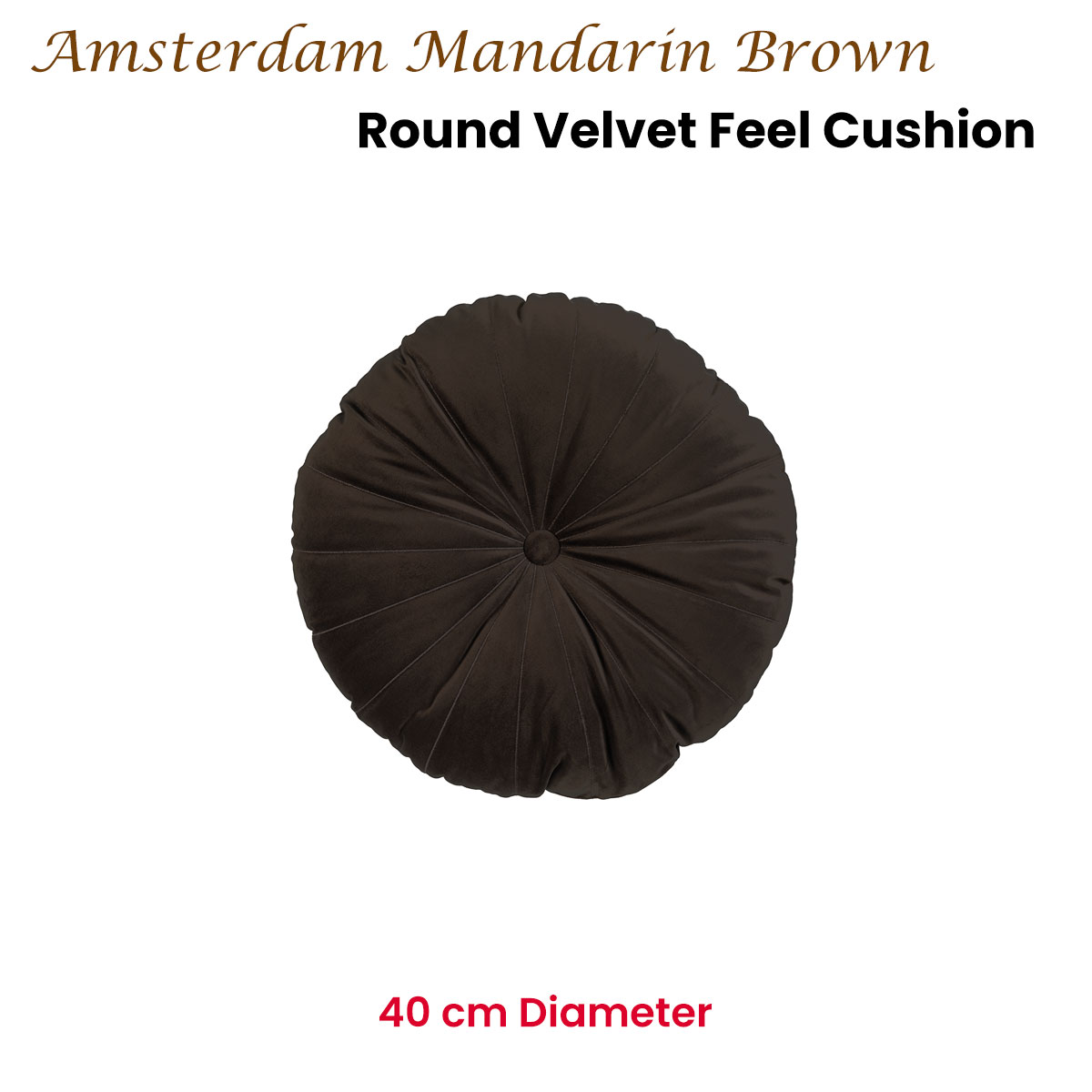 Decorative cushion KAAT Amsterdam Mandarin Brown Round Filled Cushion 40cm Diameter is a must-have for any interior. The cushion has a striking round shape with a covered button in the middle. Made from velvet polyester in a beautiful shade of brown this contemporary cushion will add a touch of luxury to your interior. The decorative cushion Mandarin is made from polyester and the backing is plain dyed cotton fabric and with a diameter of 40 cm. The cushion comes with a resilient polyester inner cushion. The cushion cannot be washed in the washing machine and is not suitable for tumble drying.