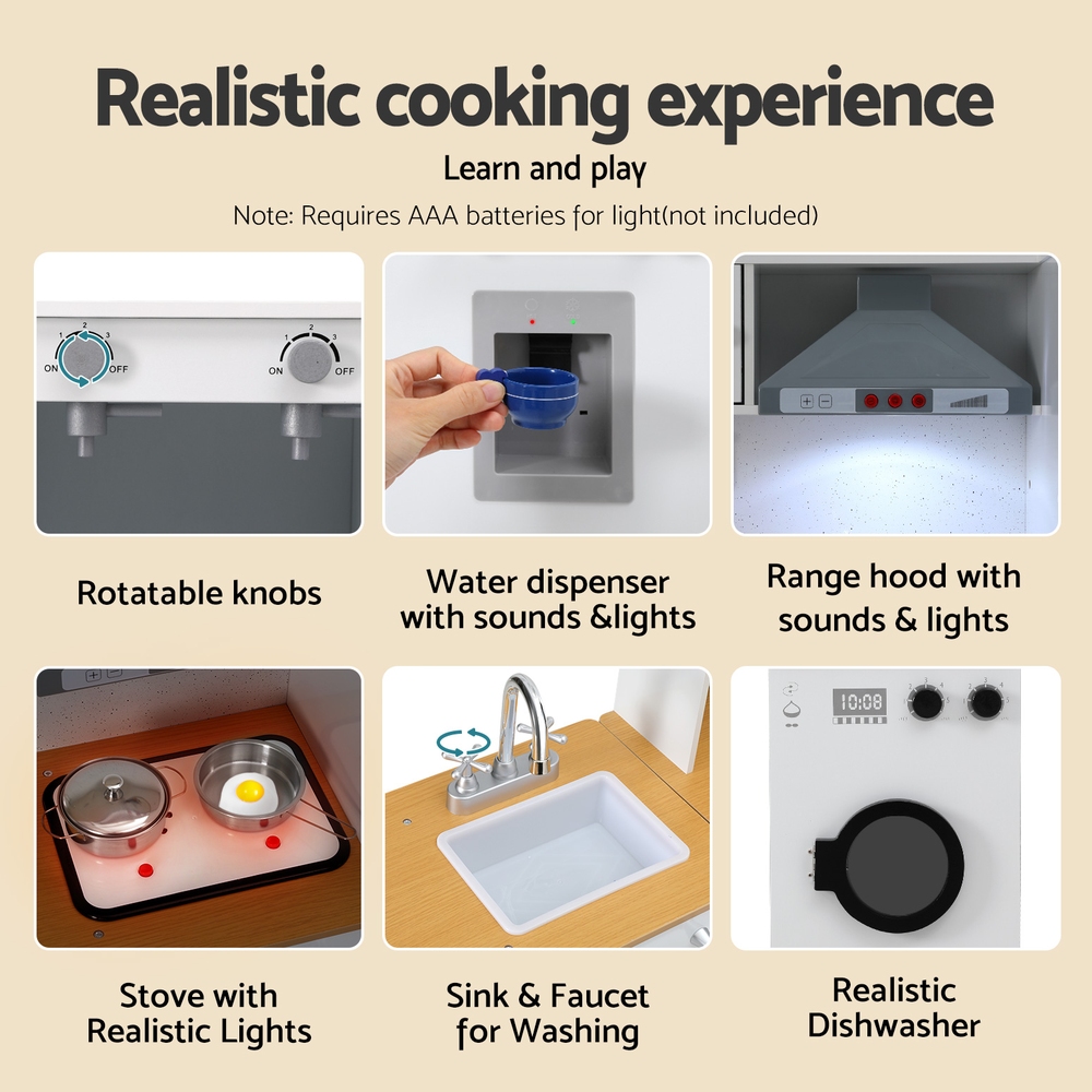 Introducing our Keezi Kids Wooden Kitchen Playset: features a sturdy MDF and solid wood construction, smooth easy-clean surfaces, ample storage, and simple assembly with detailed instructions. The perfect gift for young aspiring chefs!
