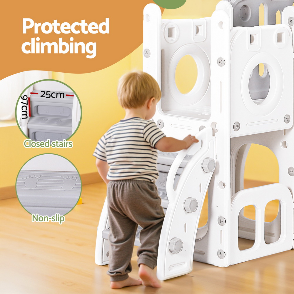 Keep your kids active and entertained with the Keezi 3-in-1 play set. It includes a wide platform, fun telescope, and dual ladder for endless fun. Built from premium HDPE in stylish grey and white, it features anti-slip steps, safe grip handles, and ample bottom space for toy storage. One ball and ring are included for added play. Easy to assemble and ideal for indoor or outdoor use. Note: Kids should be supervised by adults when using the swing.