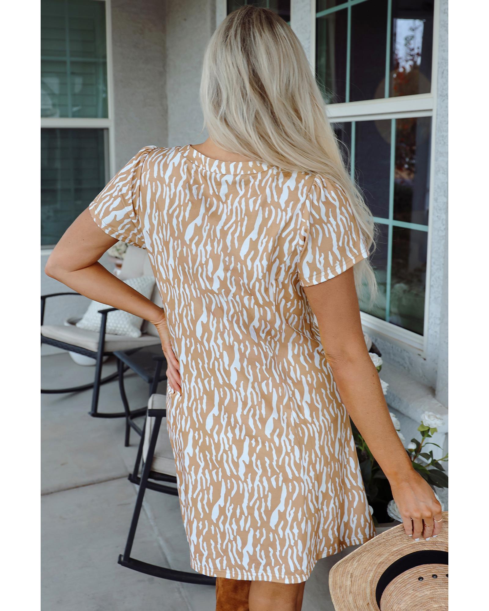 Khaki Abstract Print V Neck Short Sleeve Shift T Shirt Dress – L