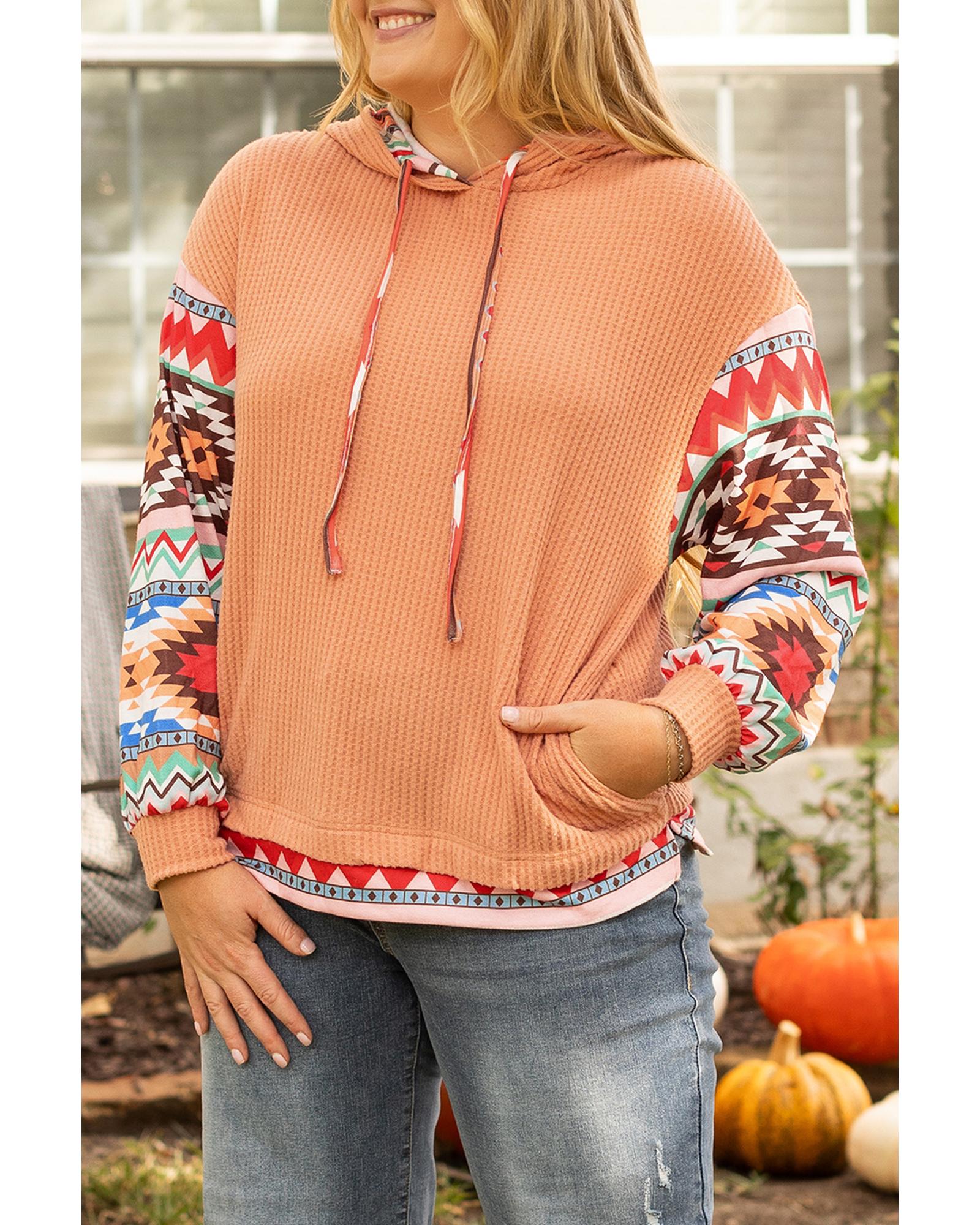 Khaki Aztec Patchwork Waffle Knit Plus Size Hoodie – 3X