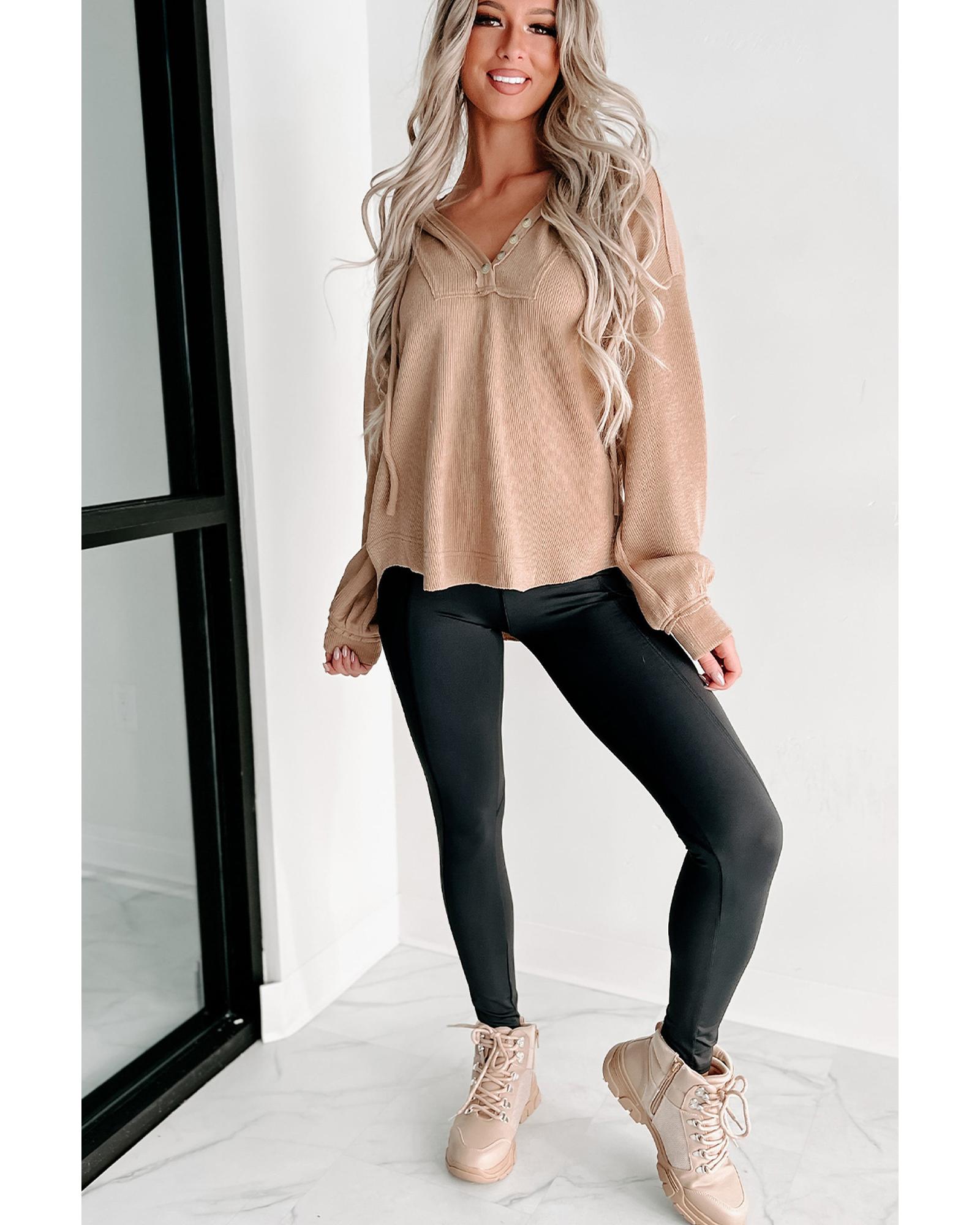 Khaki Buttoned V Neck Drawstring Knit Hoodie – L