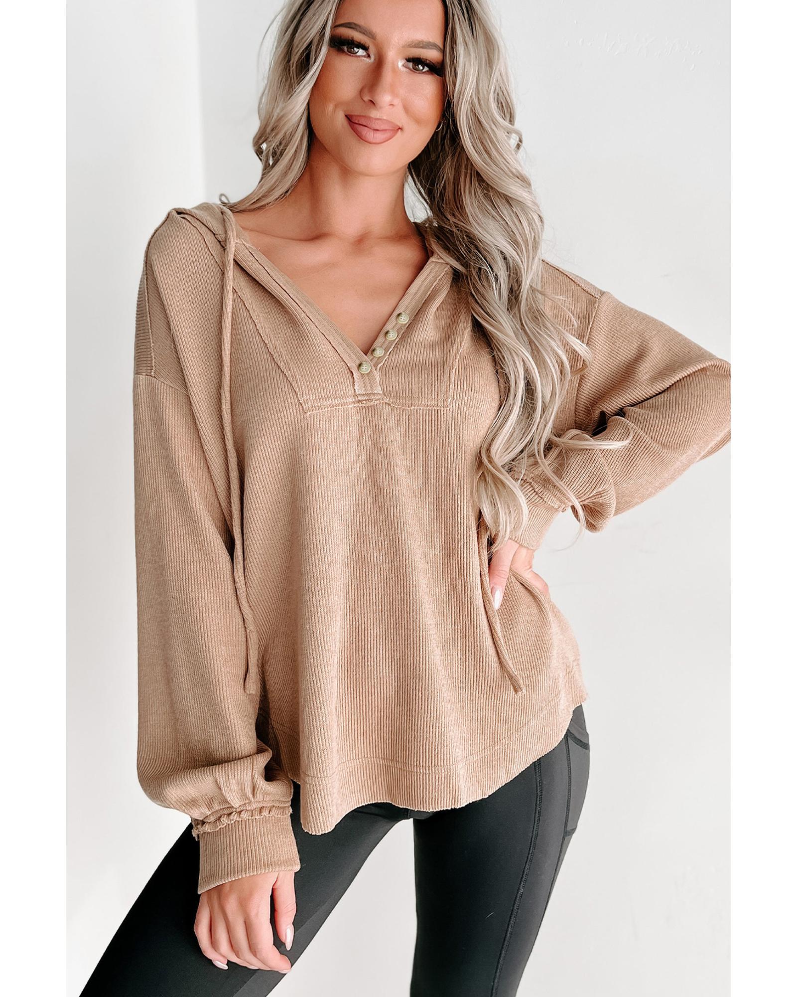 Khaki Buttoned V Neck Drawstring Knit Hoodie – S
