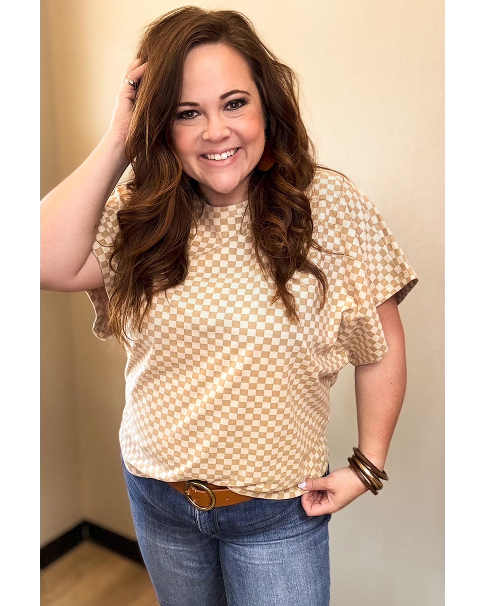 Khaki Checkerboard Short Batwing Sleeve Round Neck Plus Size T Shirt – 1X