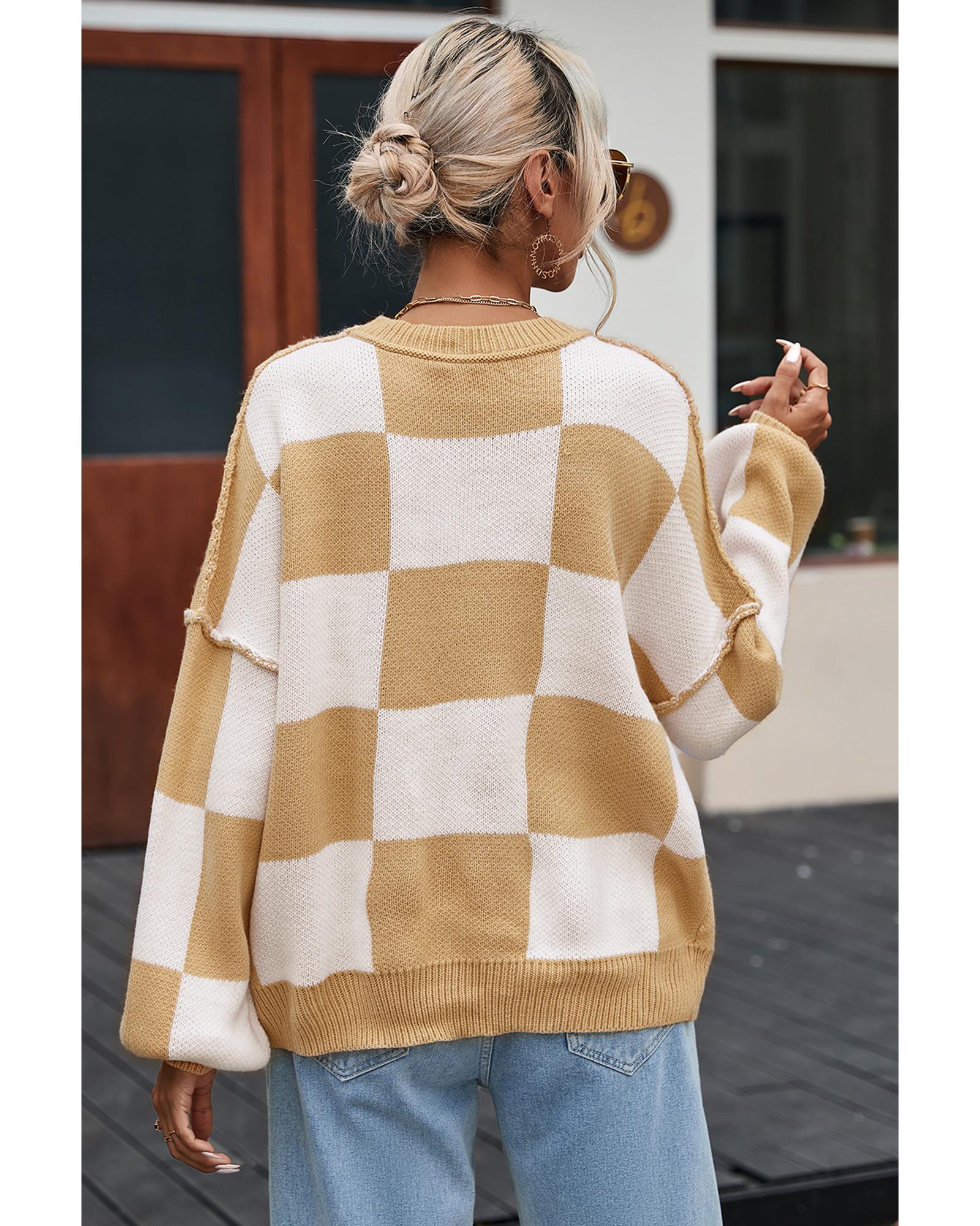 - Stylish Khaki Checkered Bishop Sleeve Sweater