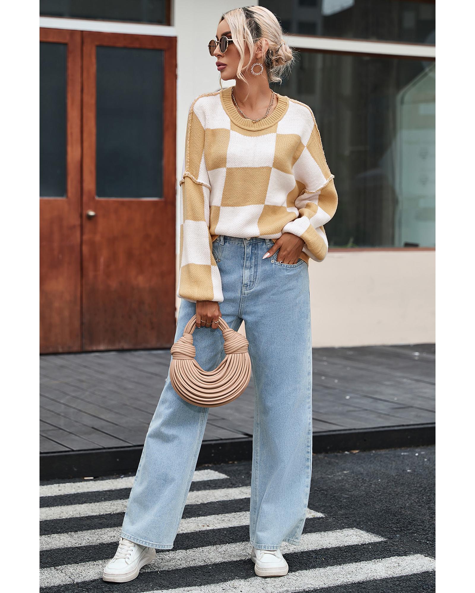 - Stylish Khaki Checkered Bishop Sleeve Sweater