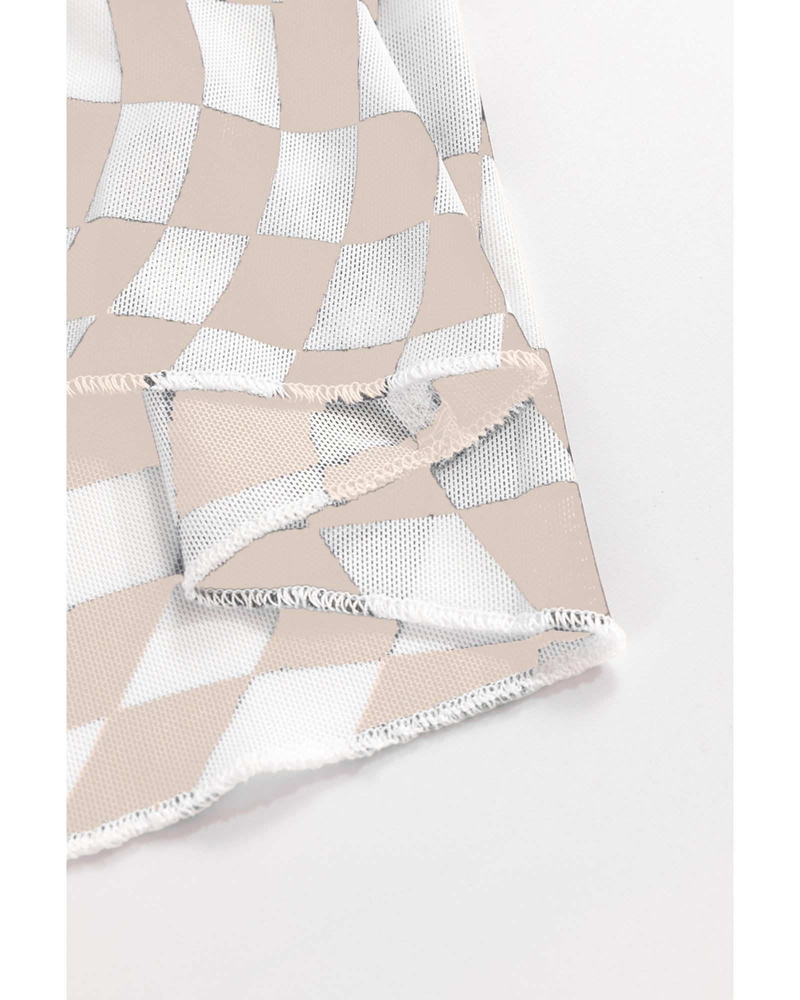 Khaki Checkered Pattern Mesh Mock Neck Long Sleeve Top – S