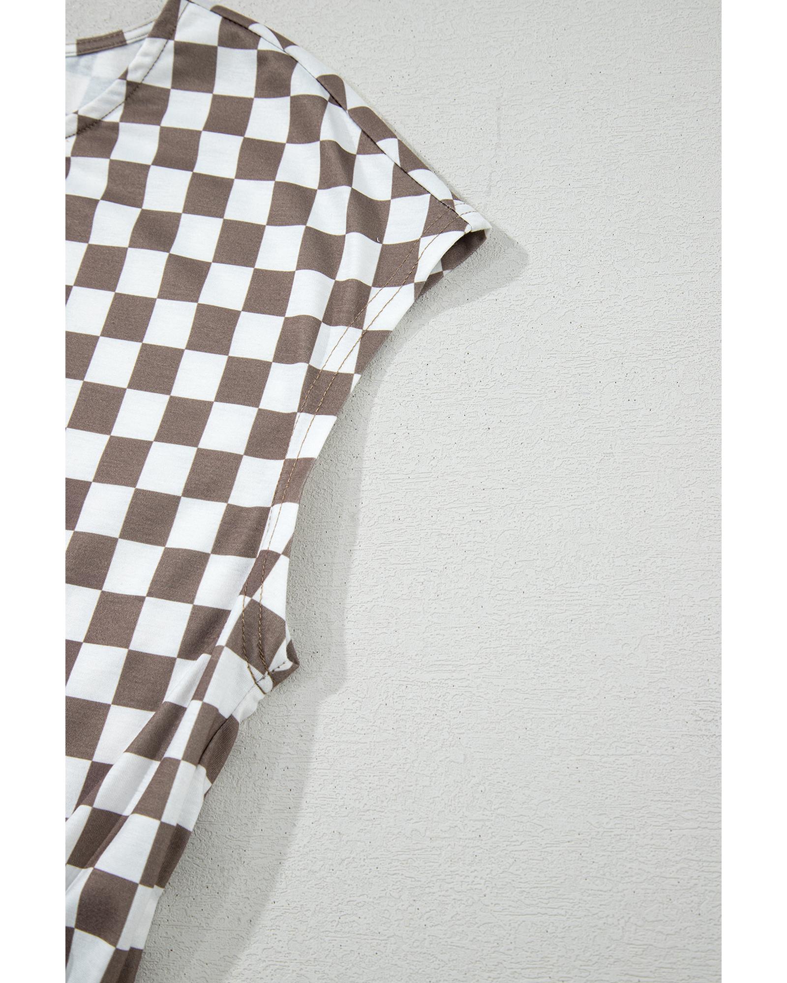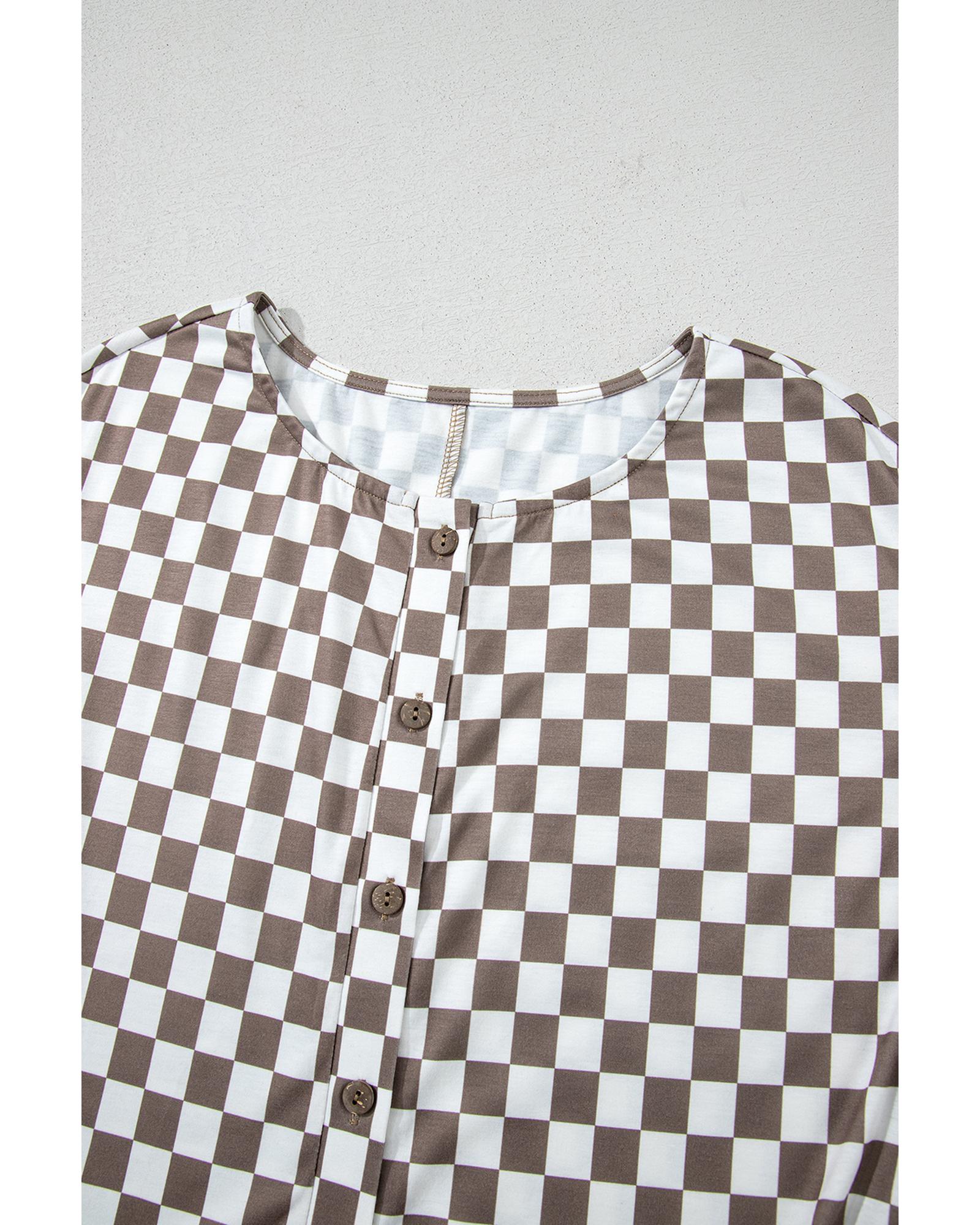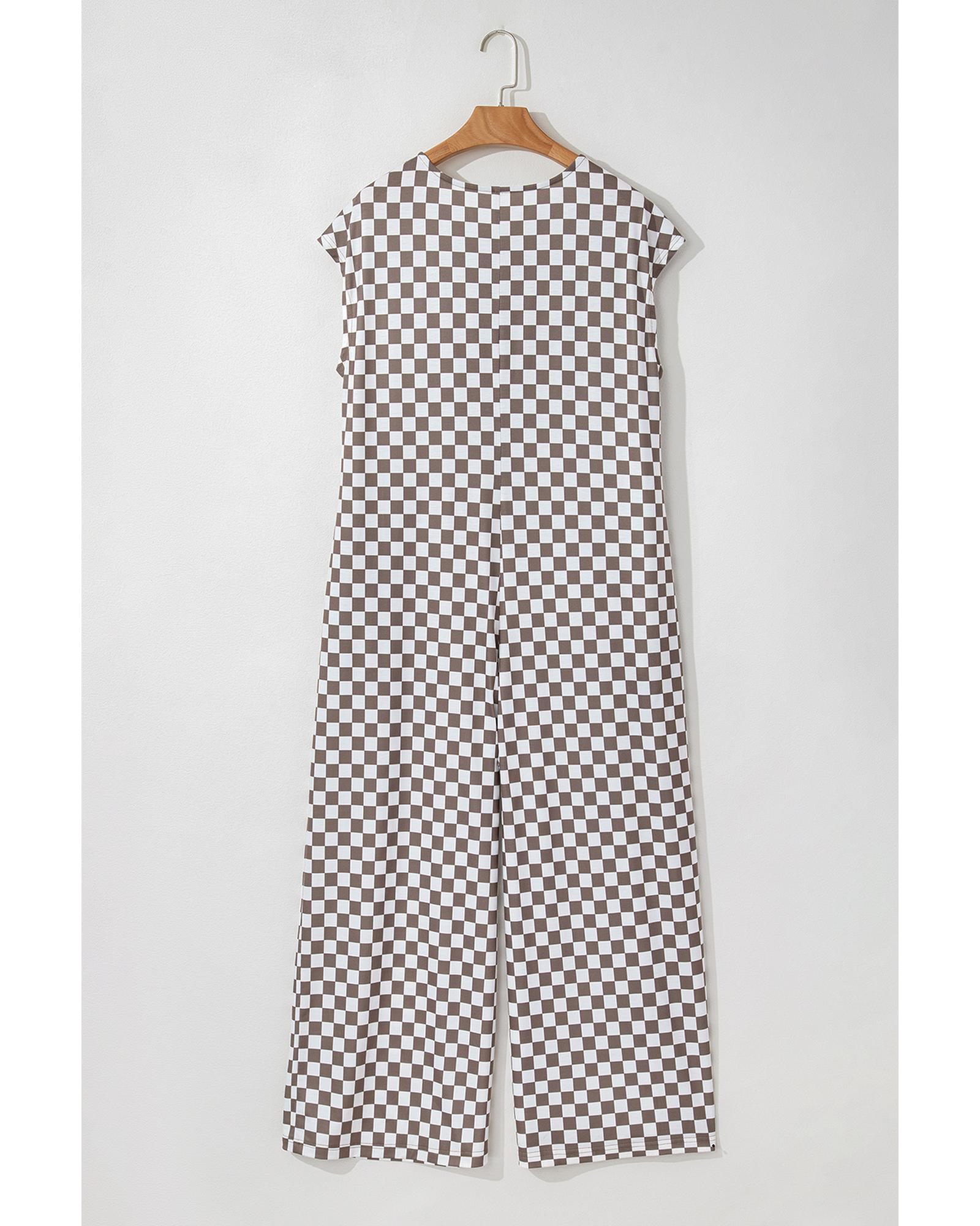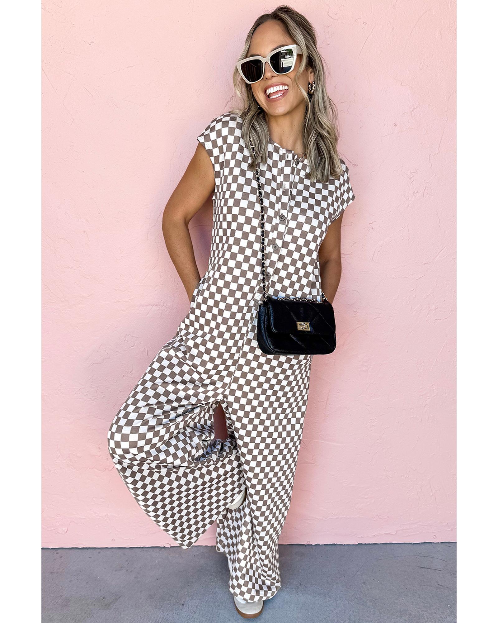 Khaki Checkered Print Buttoned Crew Neck Wide Leg Jumpsuit – S