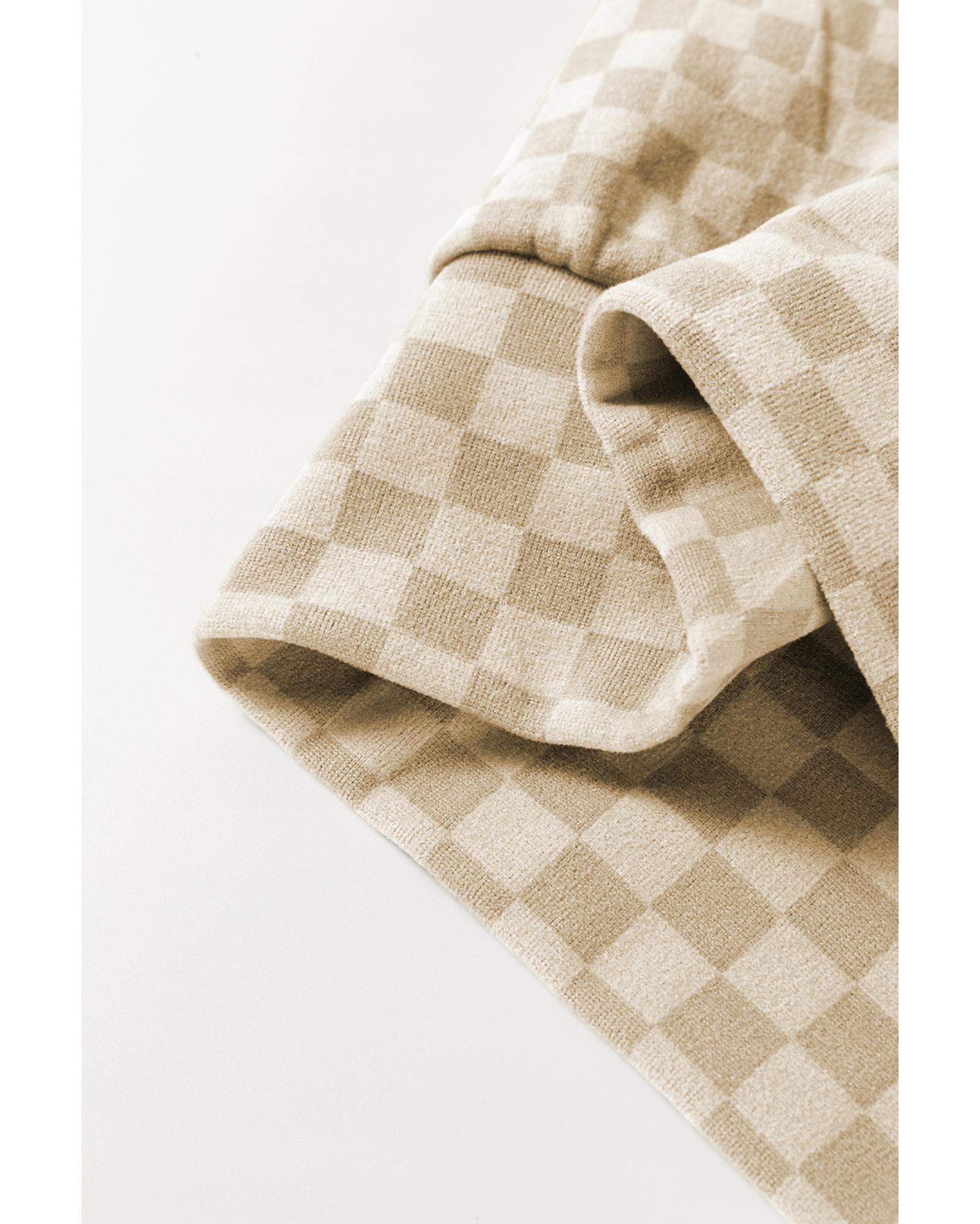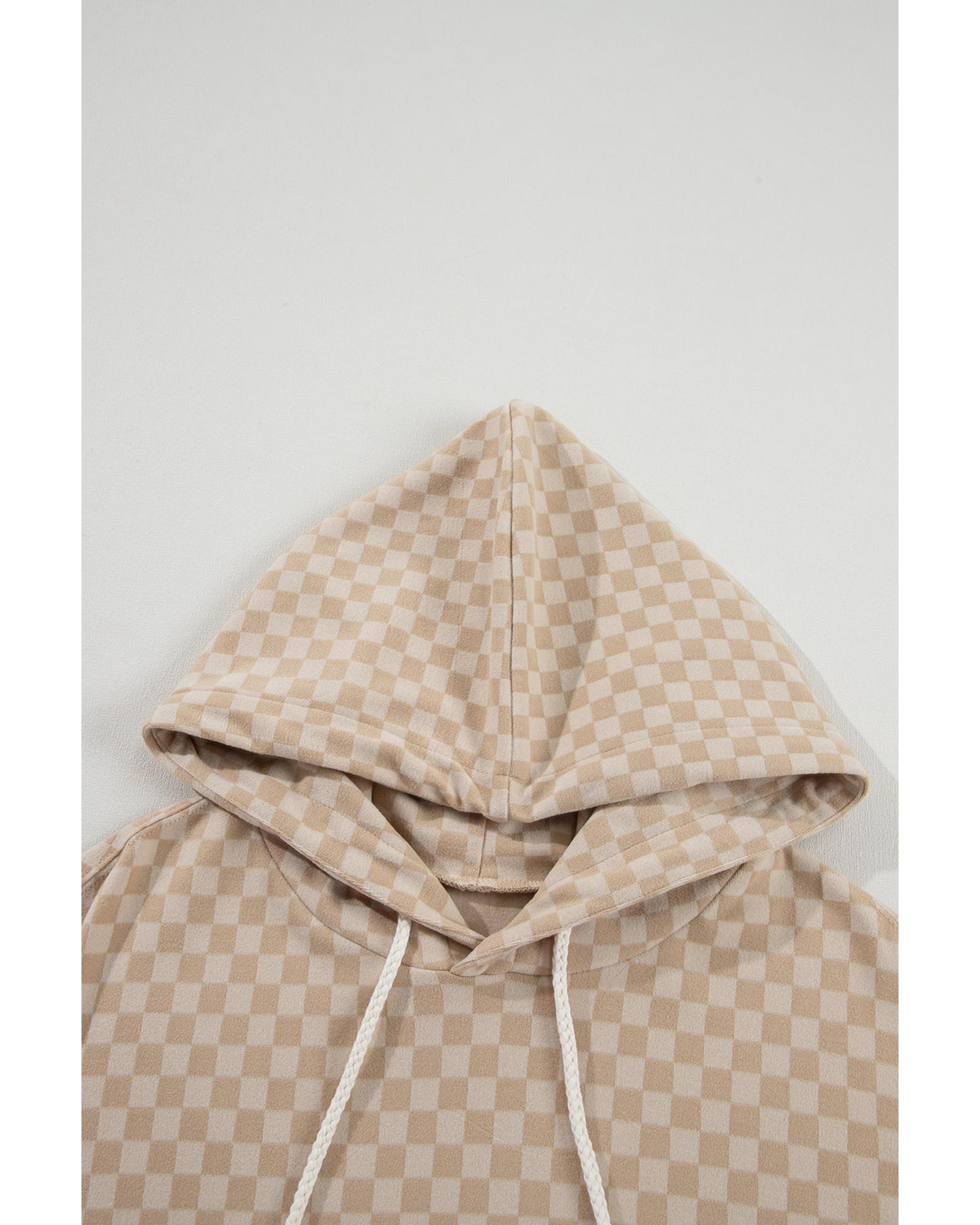 Khaki Checkered Print Kangaroo Pocket Drawstring Hoodie – M