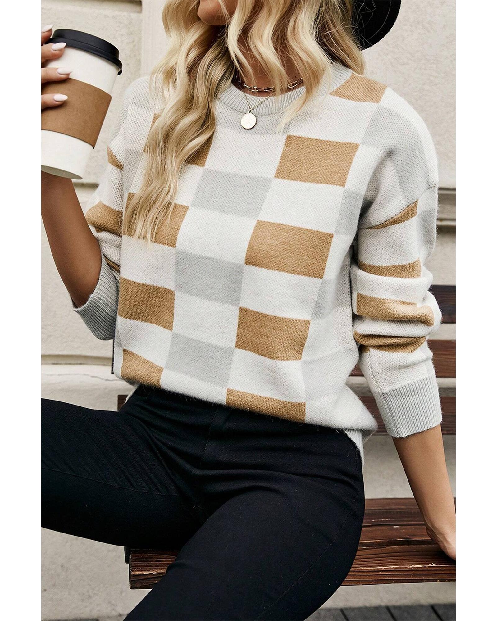 - Khaki Checkered Ribbed Edge O Neck Drop Shoulder Sweater