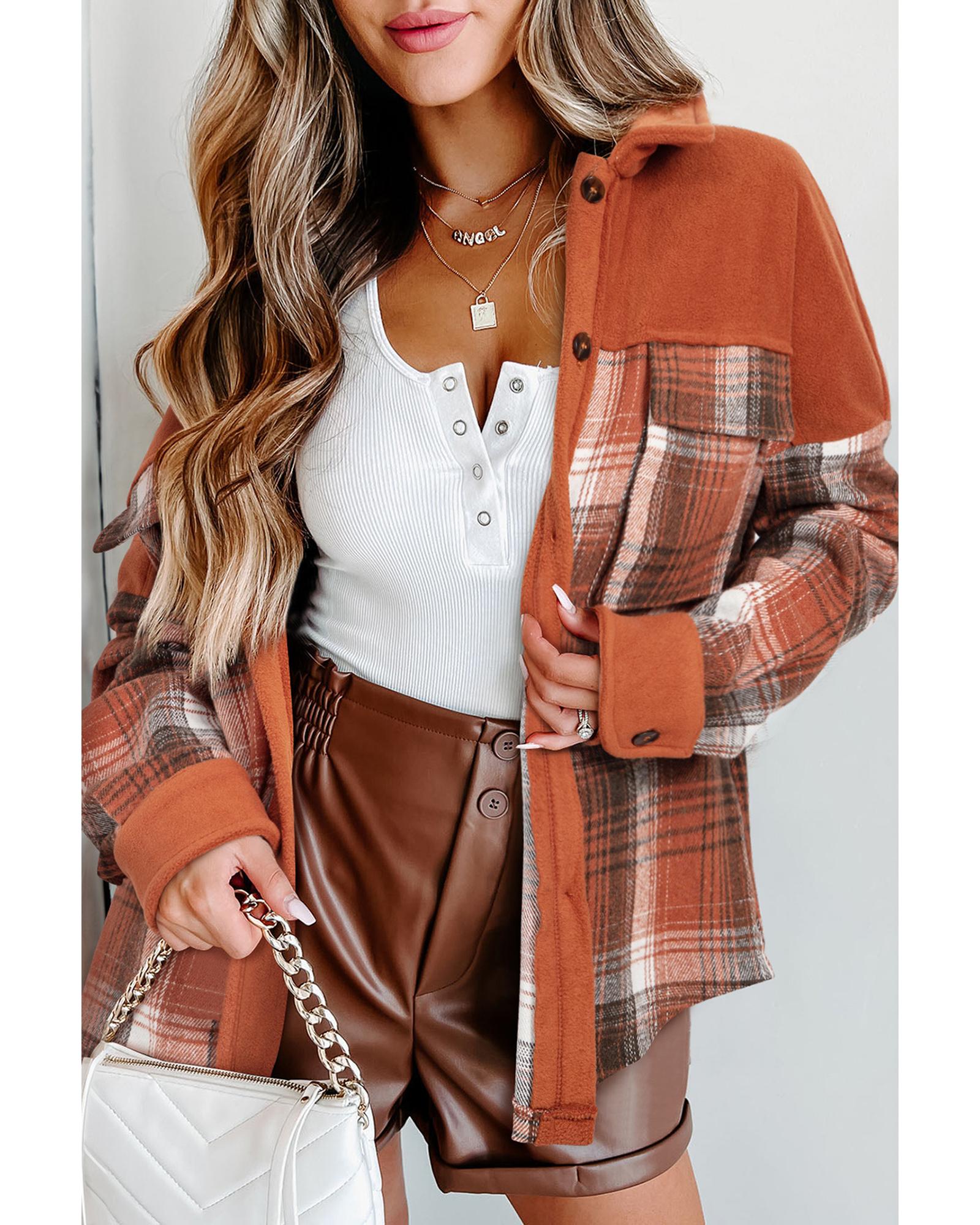 Khaki Colorblock Plaid Pattern Flap Pockets Buttoned Shacket - M