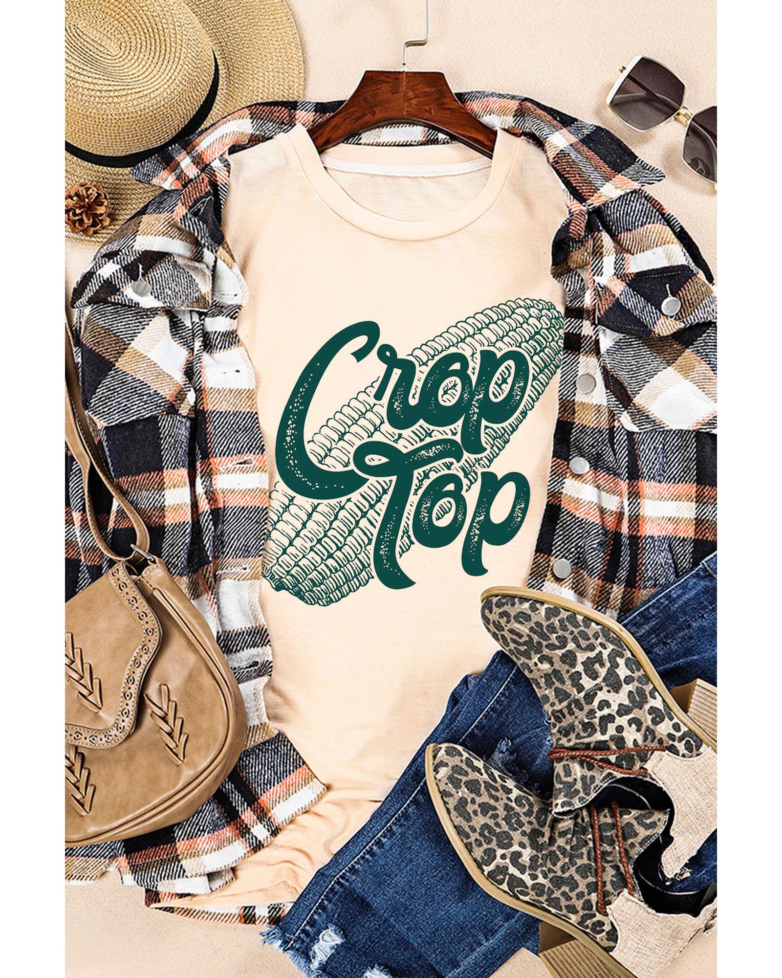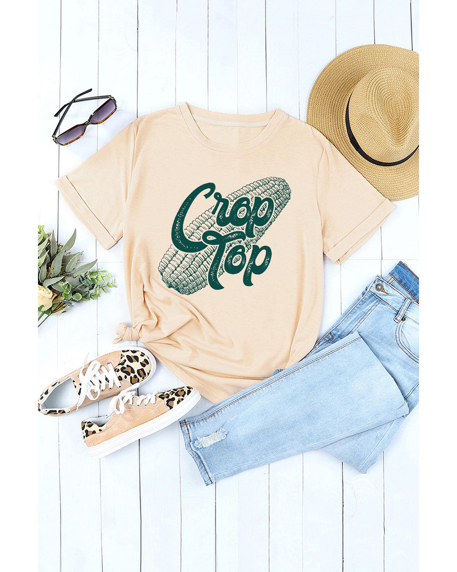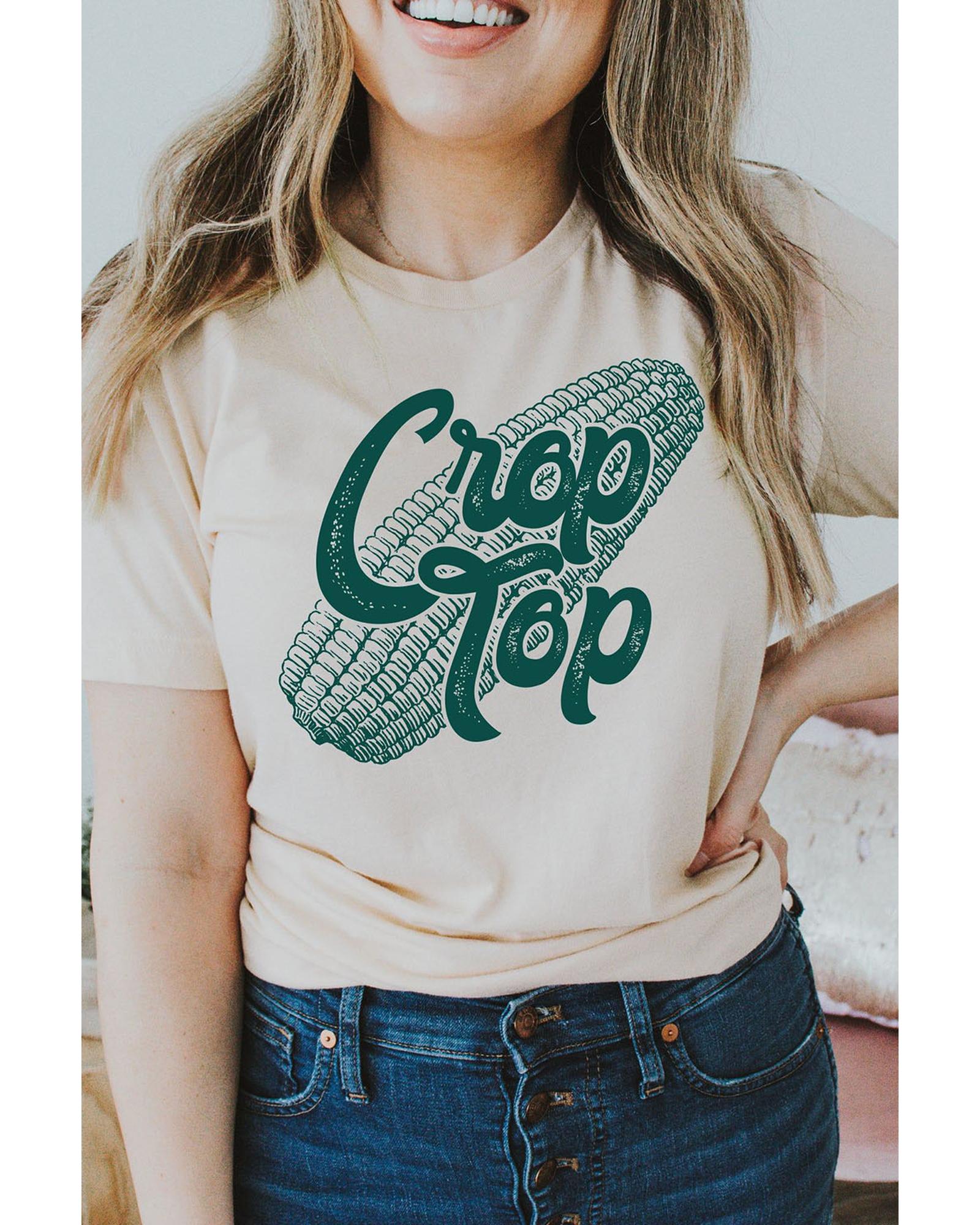 Stylish and trendy Khaki Corn Crop Top Graphic Tee Made with high - quality materials for a comfortable fit Unique graphic design adds a touch of sophistication Available in multiple sizes for the perfect fit Pairs well with jeans or shorts for a casual and fashionable look Ideal for women who appreciate luxury and style