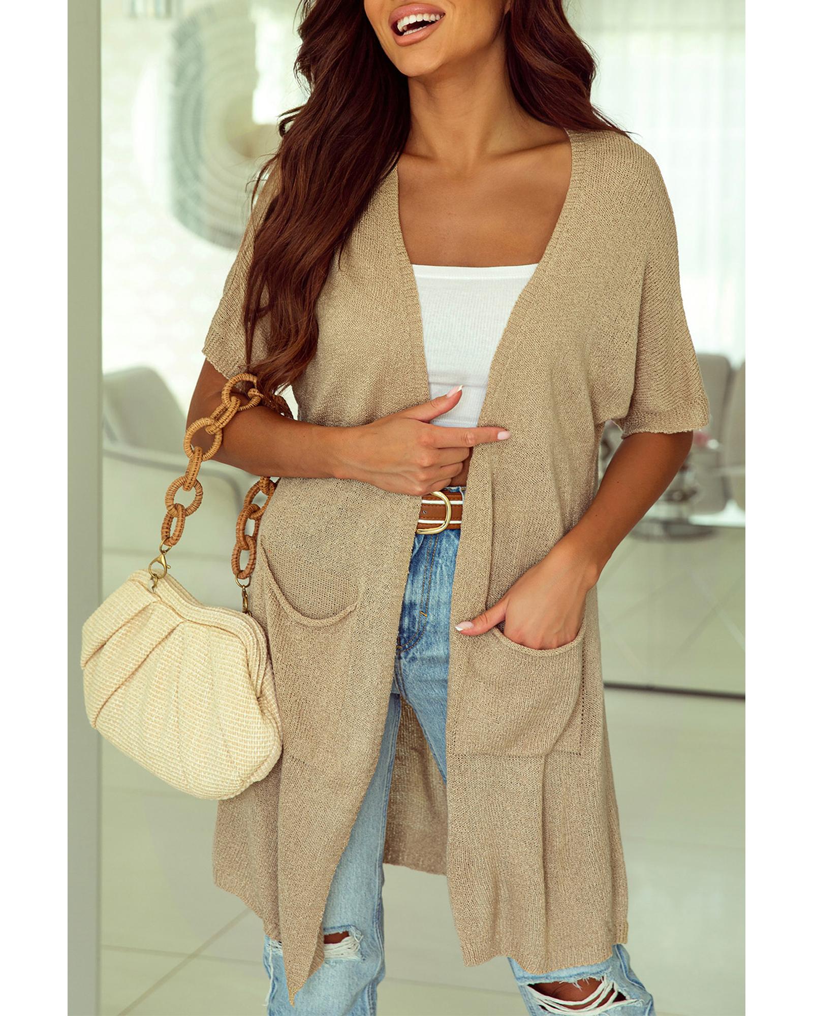 - Khaki Dolman Half Sleeve Pocketed Long Cardigan