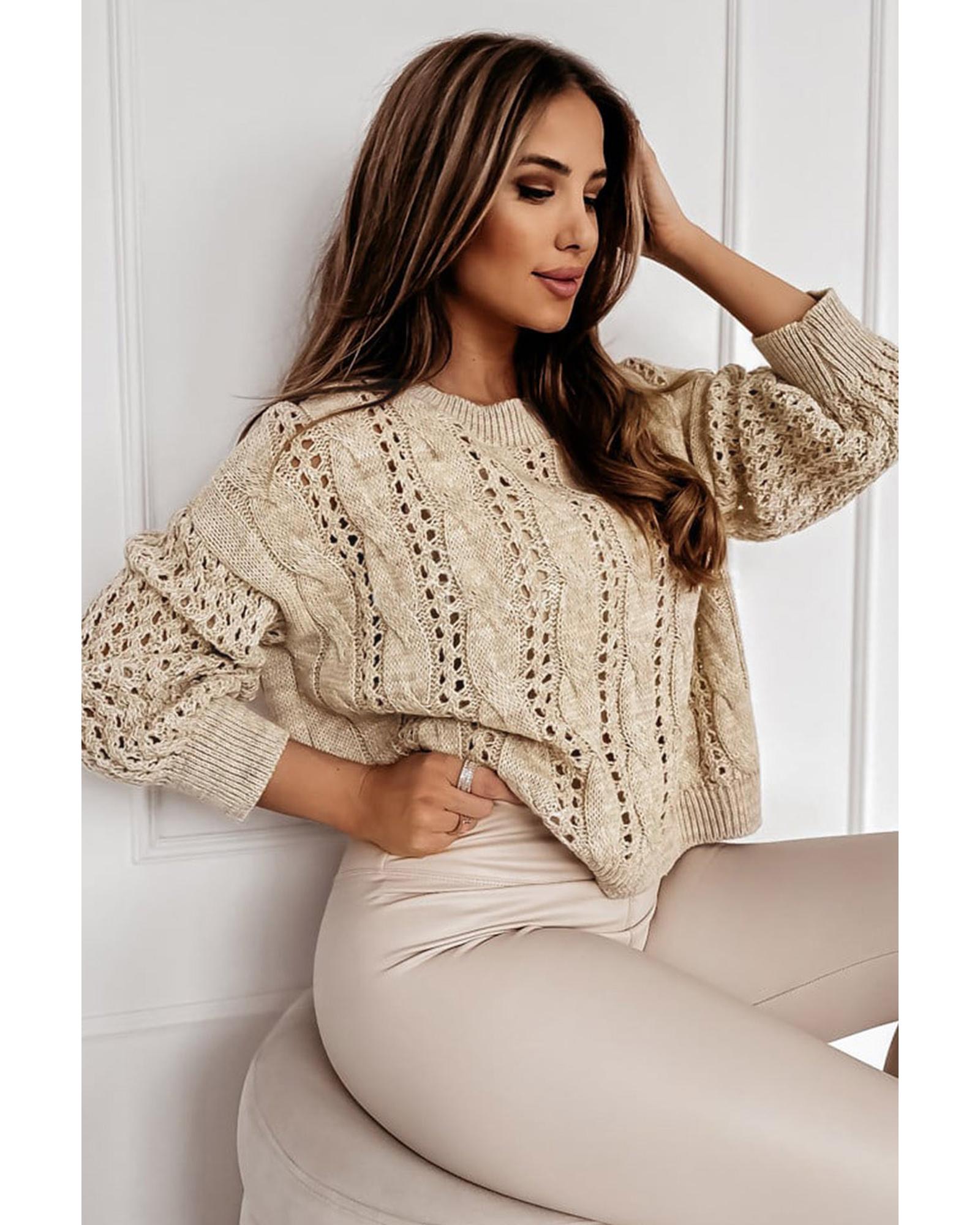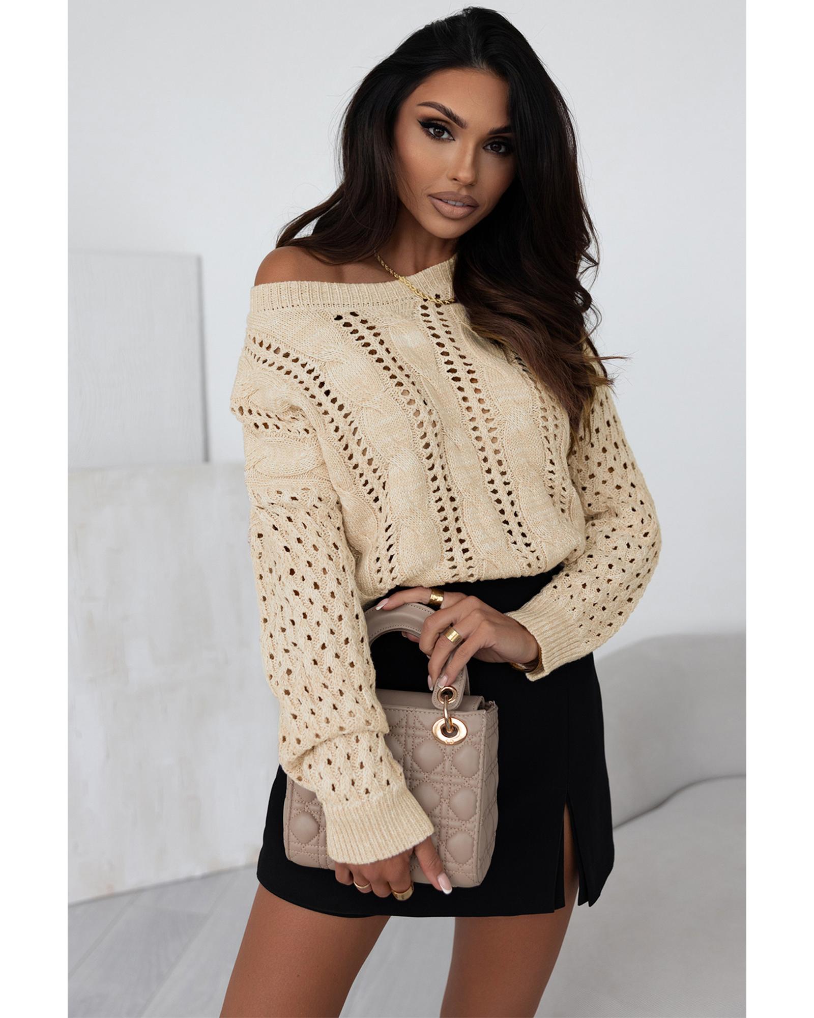 Khaki Eyelets Cable Knit Drop Shoulder Sweater – XL