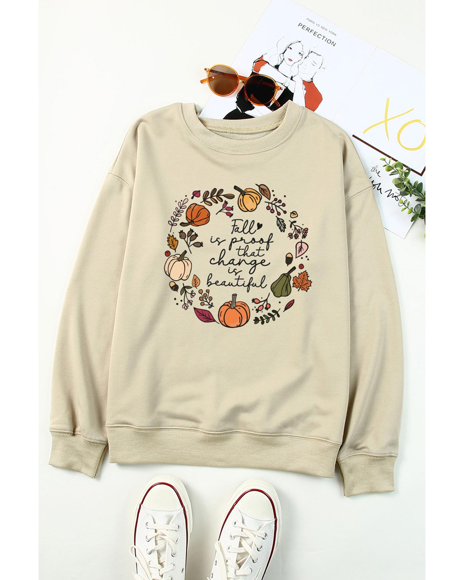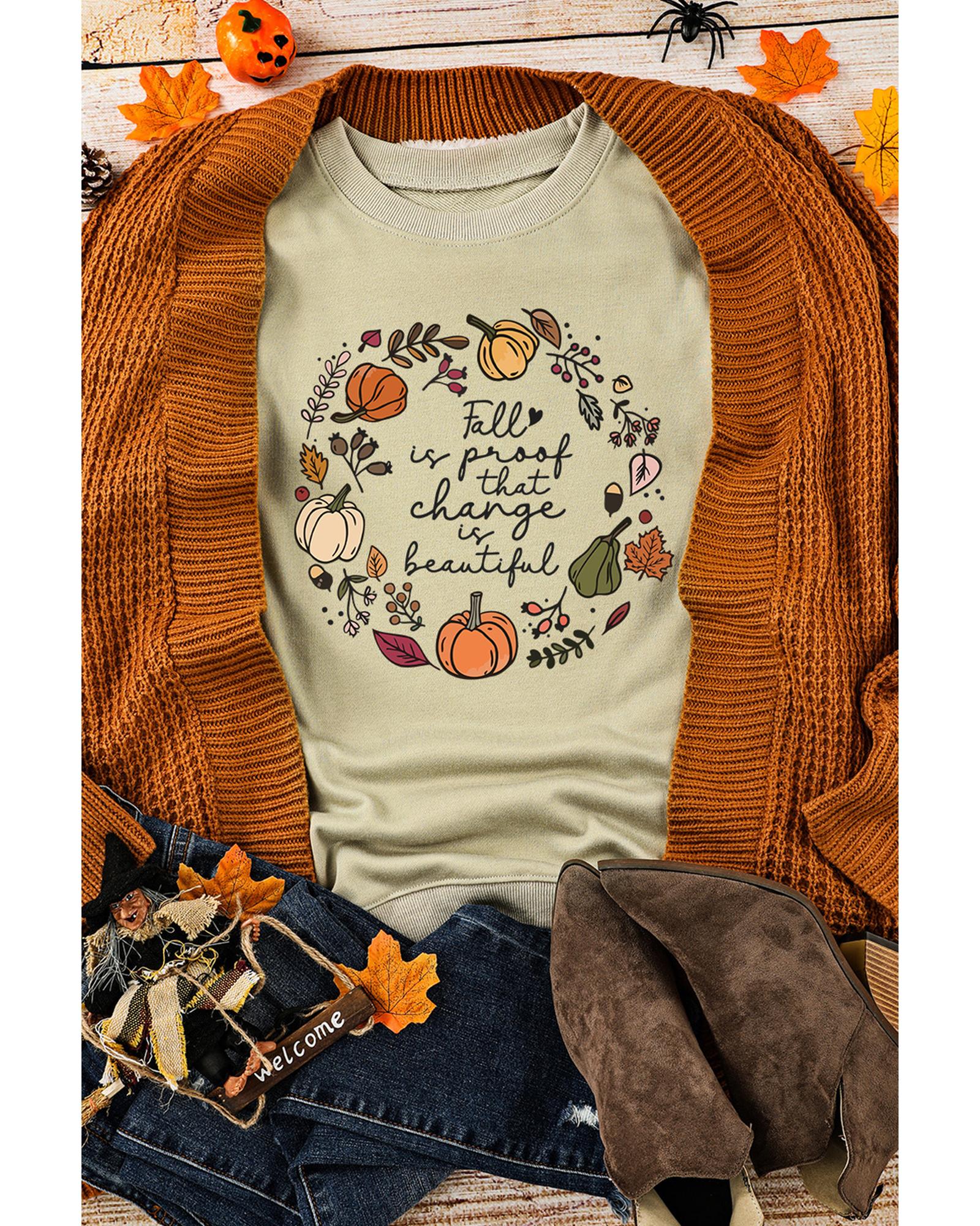 • Khaki Fall Vibe Pumpkin Print Round Neck Sweatshirt