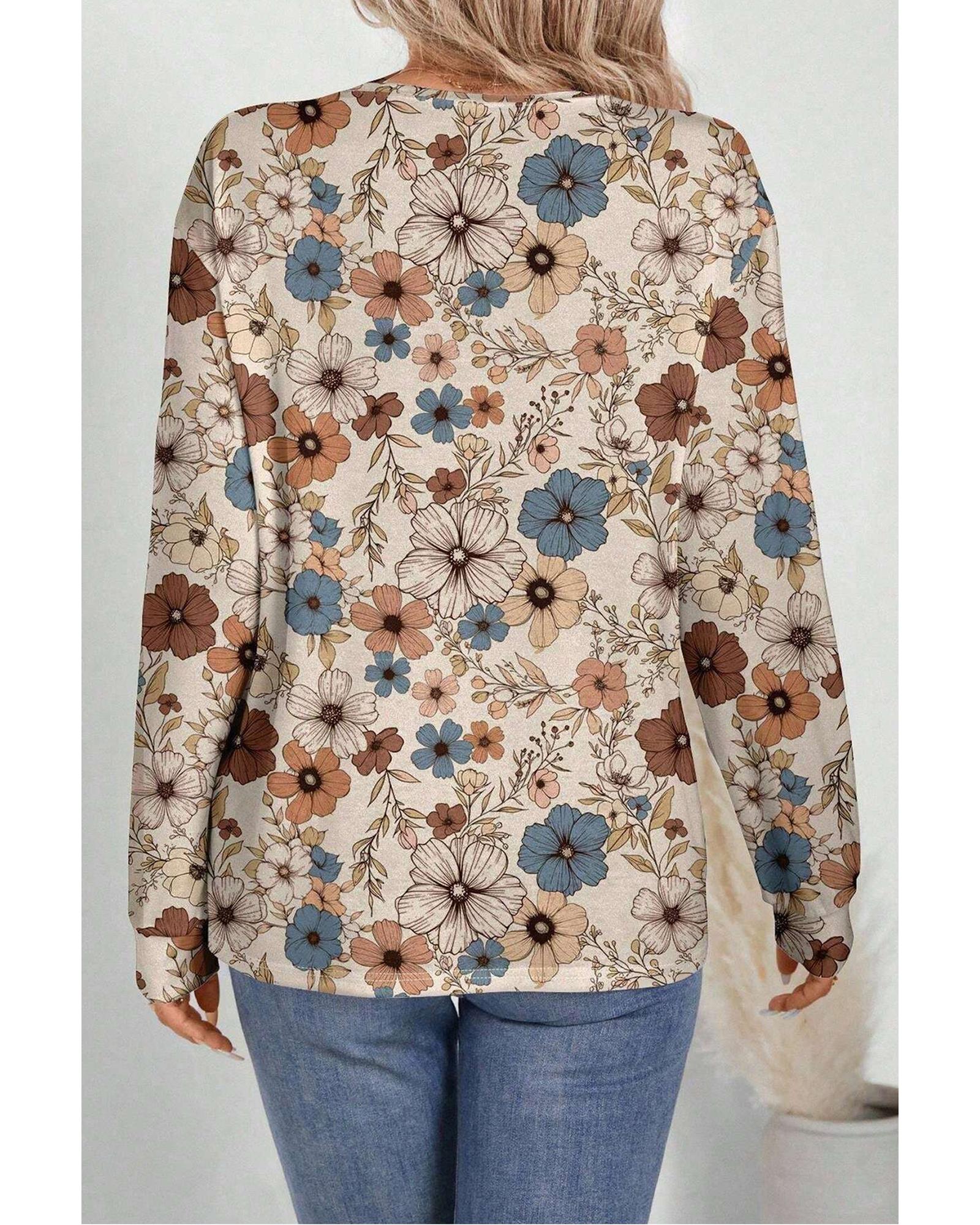 Khaki Floral Print Loose Crew Neck Long Sleeve T Shirt – S